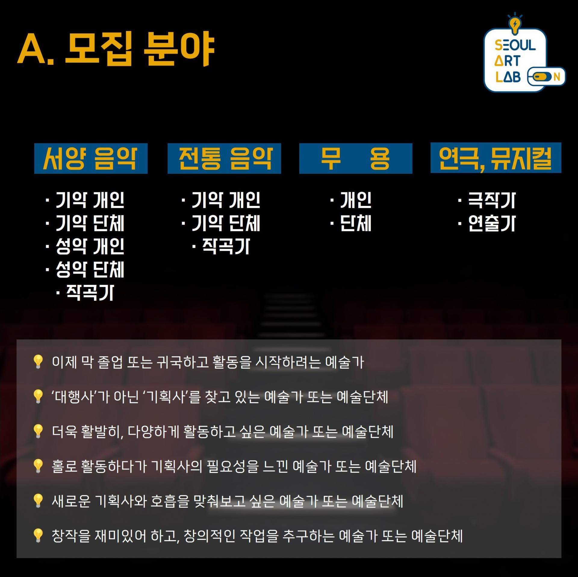 | 분야·대상 | 서양음악, 전통음악, 무용, 연극, 뮤지컬 등 | 인원 | - |