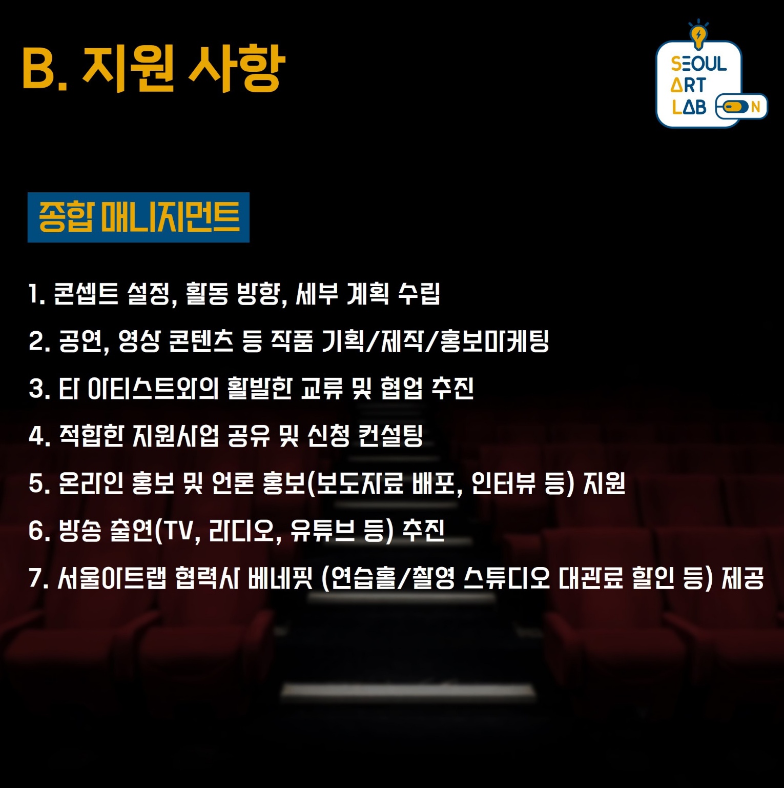 ![]() ![]() ![]() ![]() 안녕하세요. 아티스트와 함께 성장하는 연구소, 서울아트랩입니다. 서울아트랩은 공연기획&아티스트 매니지먼트사로 제2회 서울아트랩 전속 아티스트 정시 모집을 9월 1일부터 24일까지 진행합니다. 서울아트랩의 기획 스타일과 소개, 작품 이력 등은 서울아트랩 블로그와 홈페이지에서 상세히 보실 수 있으며 홈페이지에서 신청서를 다운받아 작성하신 후 이메일로 제출해주시기 바랍니다. 서울아트랩은 새로운 시도를 지향하며, 전속 아티스트간 적극 협업합니다. 활발히 활동할 아티스트분들의 많은 관심과 지원 바랍니다. 홈페이지 바로가기https://www.seoulartlab.kr/application ○ 모집 분야1. 서양 음악 : 기악 개인/단체, 성악 개인/단체, 작곡가2. 전통 음악 : 기악 개인/단체, 작곡가3. 무용 : 개인/단체4. 연극, 뮤지컬 : 극작가, 연출가○ 지원 사항1. 콘셉트 설정, 활동 방향, 세부 계획 수립2. 공연, 영상 콘텐츠 등 작품 기획/제작/홍보마케팅3. 타 아티스트와의 활발한 교류 및 협업 추진4. 적합한 지원사업 공유 및 신청 컨설팅5. 온라인 홍보 및 언론 홍보(보도자료 배포, 인터뷰 등) 지원6. 방송 출연(TV, 라디오, 유튜브 등) 추진7. 서울아트랩 협력사 베네핏 (연습홀/촬영 스튜디오 대관료 할인 등) 제공○ 신청 방법1. 서울아트랩 홈페이지 내 신청서 다운로드, 작성하여 이메일 제출서울아트랩 홈페이지 www.seoulartlab.kr서울아트랩 이메일 seoul_art_lab@naver.com2. 모집 일정- 신청서 접수 : 2023년 9월 1일(금) ~ 2023년 9월 24일(일)- 신청서 검토 : 2023년 9월 말- 세부 협의를 통한 선정 : 2023년 10월 초- 전속 계약 체결 : 2023년 10월 초,중※ 문의 (평일 오전 9시 ~ 오후 6시)- 전화 : 0507-1496-2026- 카카오톡 ID : seoul_art_lab홈페이지 바로가기
