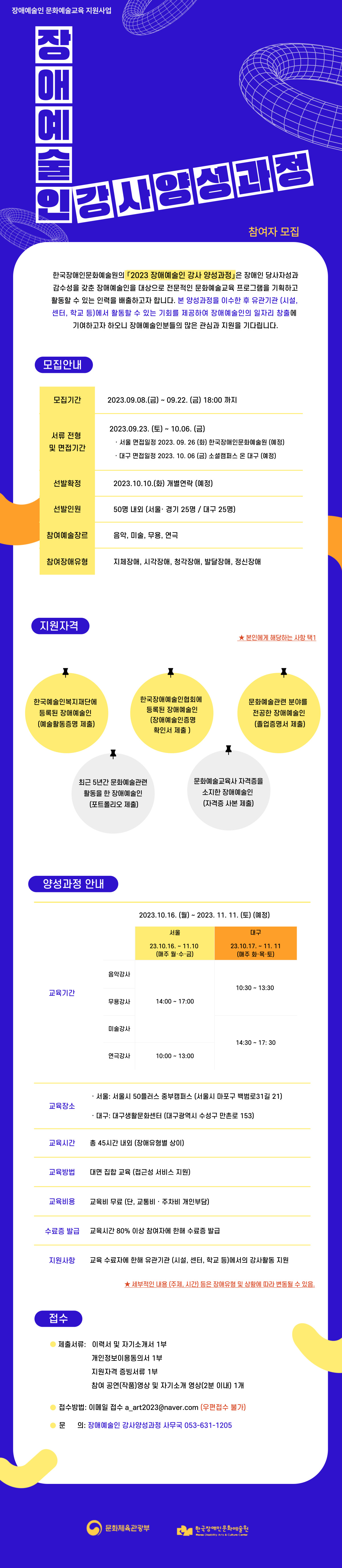 | 2023 장애예술인 강사 양성과정 참여자 모집 (~9.22) | |||
