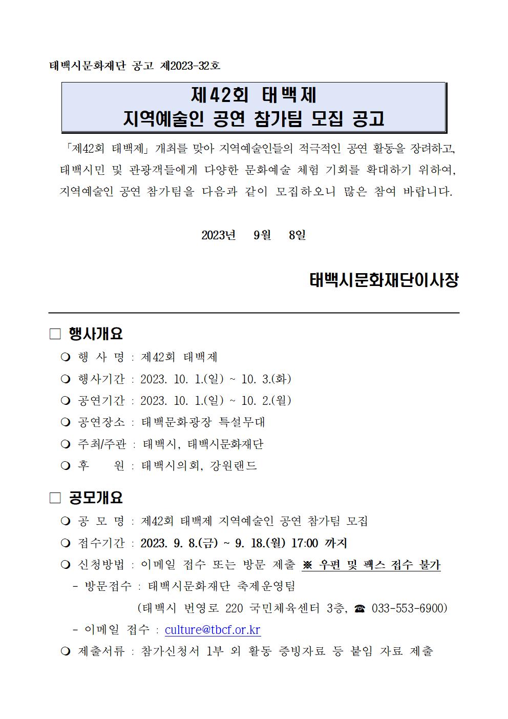 | 제42회 태백제 지역예술인 공연 참가팀 모집 공고 | |||