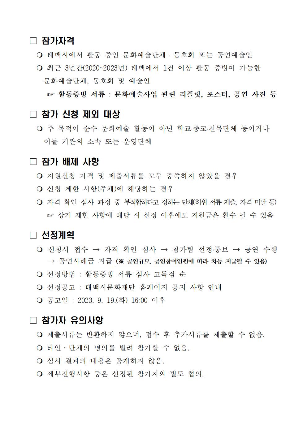 | 분야·대상 | 태백시에서 활동 중인 문화예술단체, 동호회 또는 공연예술인 | 인원 | - |