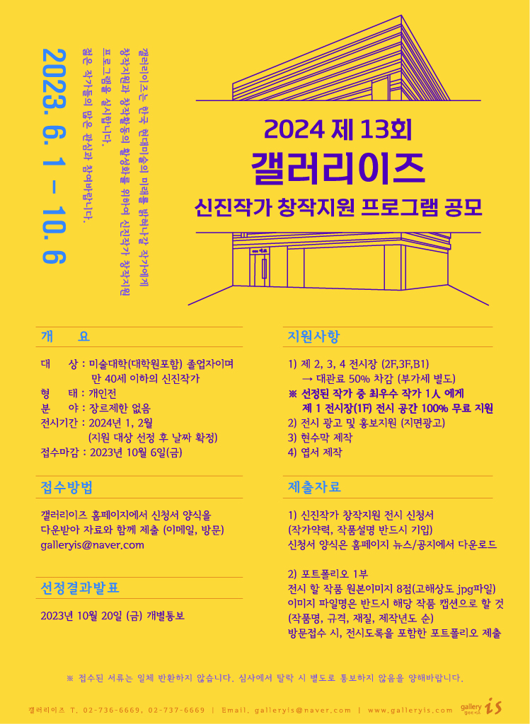 ![]() 2024 갤러리이즈 신진작가 창작지원 프로그램 안내 갤러리이즈는 한국 현대미술의 미래를 밝혀나갈 작가에게 창작지원과 창작활동의 활성화를 위하여 신진작가 창작지원 프로그램을 실시합니다. 젊은 작가들의 많은 관심과 참여바랍니다. ■ 개 요 대 상 : 미술대학(대학원포함) 졸업자이며 만40세 이하의 신진작가 형 태 : 개인전 분 야 : 장르제한 없음 전시기간 : 2024년 1, 2월 (지원 대상 선정 후 날짜확정) 접수마감 : 2023년 10월 6일(금) ■ 지원사항 1) 제 2, 3, 4 전시장(2F, 3F, B1) 대관료 50% 차감 (부가세별도) ※ 선정된 작가 중 최우수 작가 1人에게 제 1전시장(1F) 전시 공간 100% 무료 지원 2) 전시 광고 및 홍보지원 (지면광고) 3) 현수막 제작 4) 엽서제작 ■ 접수방법 - 홈페이지에서 신청서 양식을 다운받아 자료와 함께 제출 (이메일, 방문) - 이메일 접수 : galleryis@naver.com ■ 제출자료 1) 신진작가 창작지원 전시 신청서 (작가 약력, 작품설명 반드시 기입) 신청서 양식은 갤러리이즈 홈페이지 뉴스/공지에서 다운로드 2) 포트폴리오 1부 전시 할 작품 원본이미지 8점(고해상도 jpg파일) / 이미지 파일명은 반드시 해당 작품 캡션으로 할 것 (작품명, 규격 세로×가로cm, 재질, 제작년도 순) 방문접수 시, 전시도록을 포함한 포트폴리오 제출 ■ 선정결과발표 : 2023년 10월 20일(금) 개별통보 * 접수된 서류는 일체 반환하지 않습니다. 심사에서 탈락 시 별도로 통보하지 않음을 양해바랍니다