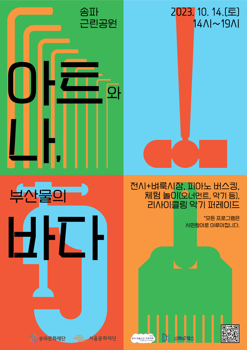 <아트나바다: 아트와 나, 부산물의 바다> 축제에 초대합니다 창작 부산물의 나눔과 순환 ▶ 일시: 10월 14일 토요일 14시~19시 ▶ 장소 : 송파근린공원 (송파대로 42길29) <아트나바다: 아트와 나, 부산물의 바다> 는 송파를 기반으로 활동하는 예술인 네트워크 '송파 예술단지'에서 제안하고 송파문화재단이 주관하는 예술 축제입니다 .