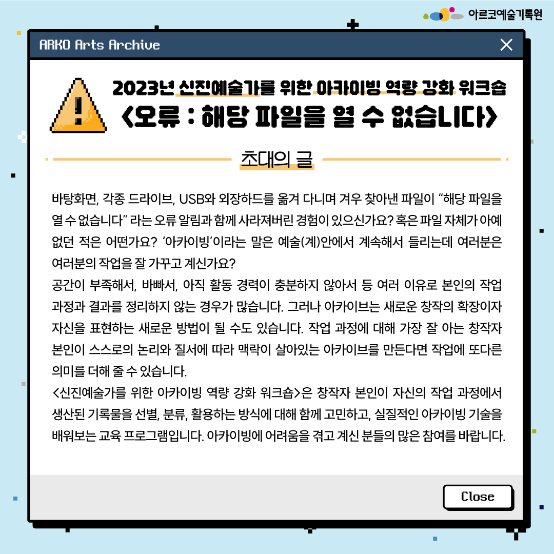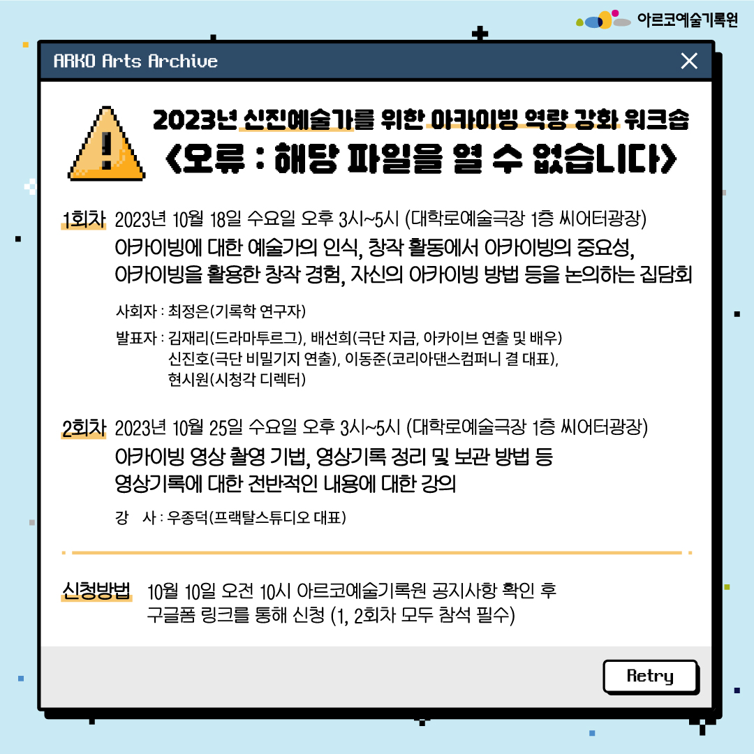 | 2023 신진예술가를 위한 아카이빙 역량 강화 워크숍 참여자 모집(10.10 10시 신청) | |||