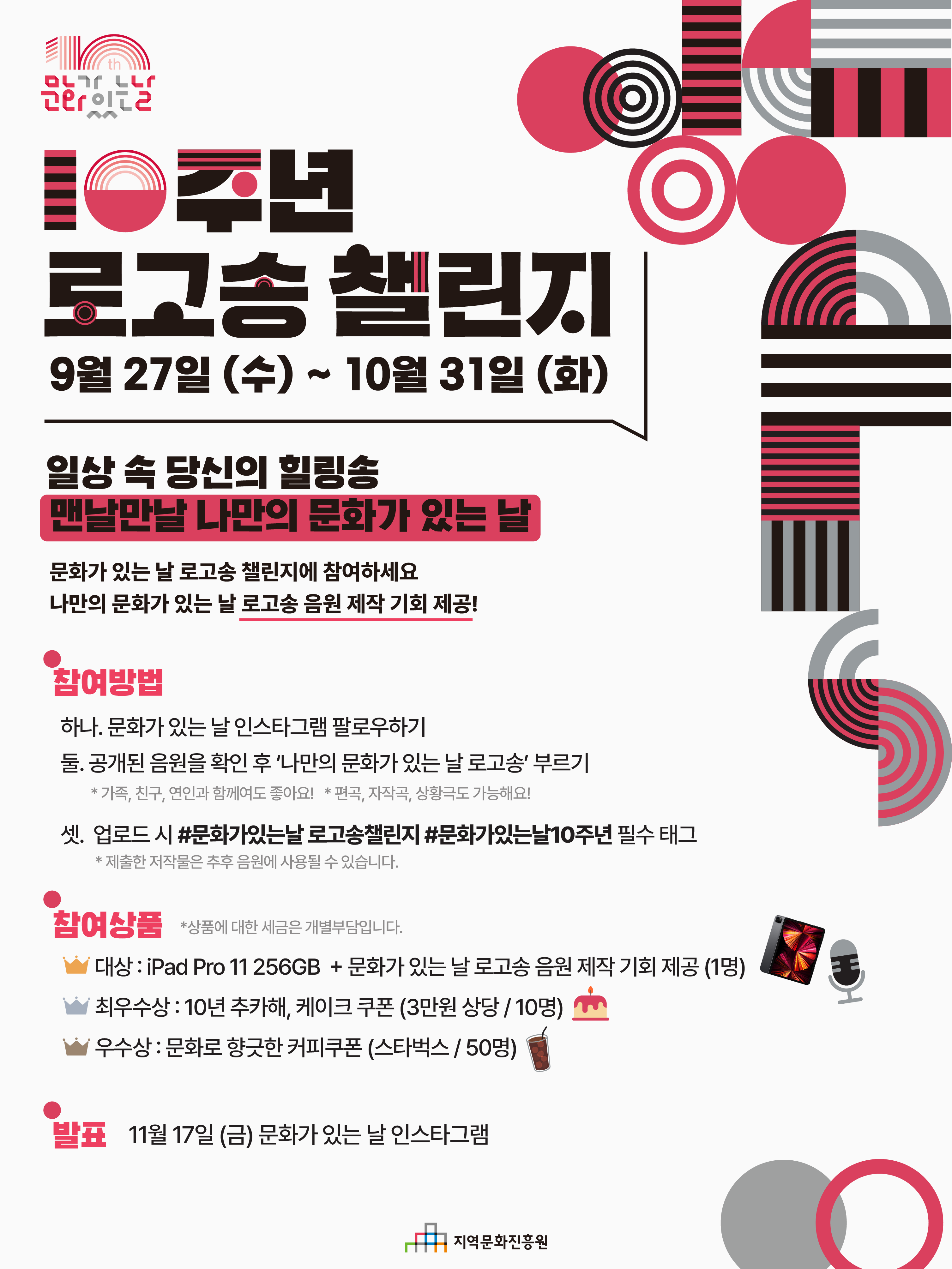 ![]() ■ 공모 주제 일상 속 당신의 힐링송 맨날만날 나만의 문화가 있는 날 ■ 공모 내용 문화가 있는 날 로고송 챌린지에 참여하세요 나만의 문화가 있는 날 로고송 음원 제작 기회 제공! ■ 지원 자격 참여하는 누구나! ■ 모집 기간 2023.9.27.(수)~2023.10.31.(화) ■ 지원 방법 하나. 문화가 있는 날 인스타그램 팔로우하기 둘. 공개된 음원을 확인 후 '나만의 문화가 있는 날 로고송'부르기 *가족, 친구, 연인과 함께여도 좋아요! *편곡, 자작곡, 상황극도 가능해요! 셋. 업로드 시 #문화가있는날로고송챌린지 #문화가있는날10주년 필수 태그 ■ 시상내역 대상 : iPad Pro 11 25GB + 문화가 있는 날 로고송 음원 제작 기회 제공 (1명) 최우수상 : 10주년 추카해, 케이크 쿠폰 (3만원 상당 / 10명) 우수상 : 문화로 향긋한 커피쿠폰 (스타벅스 / 50명) ■ 발표 2023.11.17.(금) 문화가 있는 날 인스타그램 ■ 문의 사항 담당자 정보 : 김연주 문의전화 : 02-2623-3121 메일 : blueaqua08@rcda.or.kr