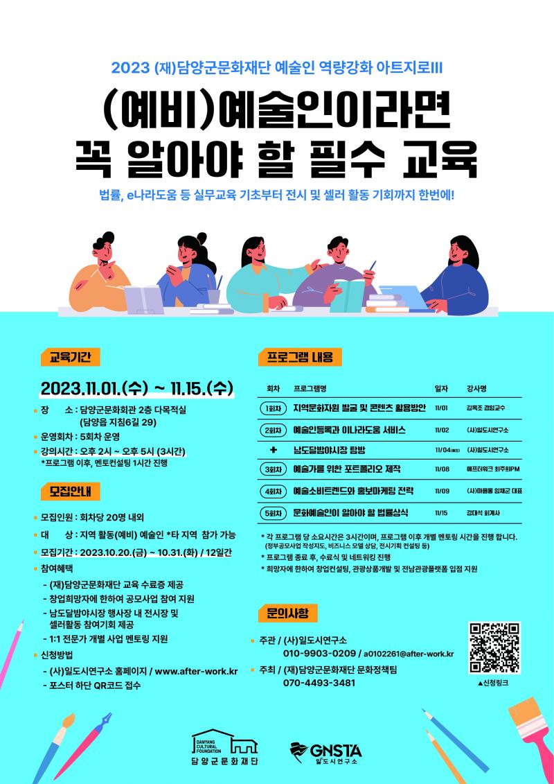 (재)담양군문화재단은 2023 지역(예비)예술인을 위한 맞춤형 역량강화 교육 프로그램을 제공하여 문화예술현장 사회적 진출 기회를 확대하고, 예술인 창작활동 지속 가능성 제고를 위해 (예비)예술인을 모집 하오니 많은 관심과 참여 바랍니다.