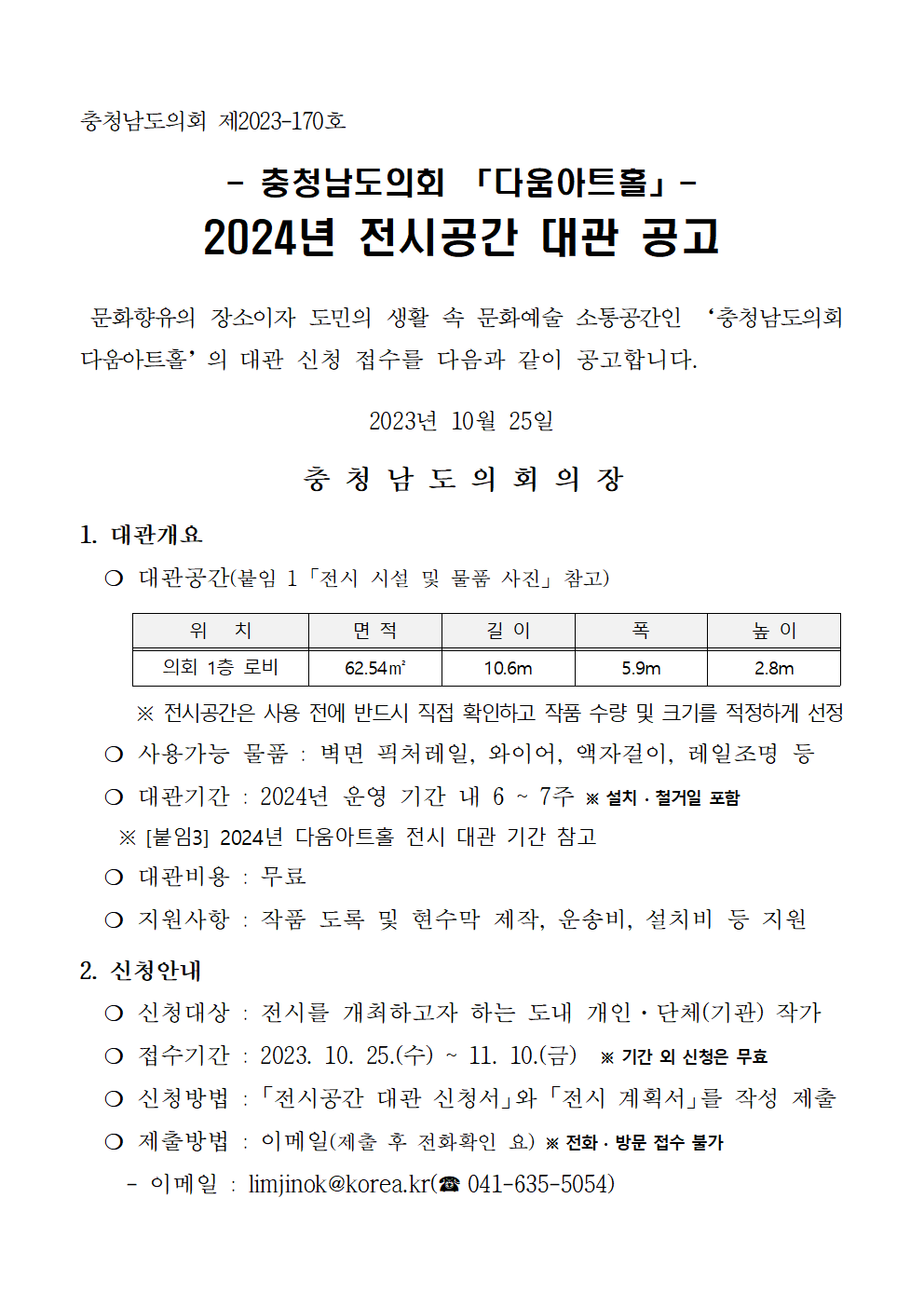 | 충청남도의회 다움아트홀 2024년 전시공간 대관 공모 | |||