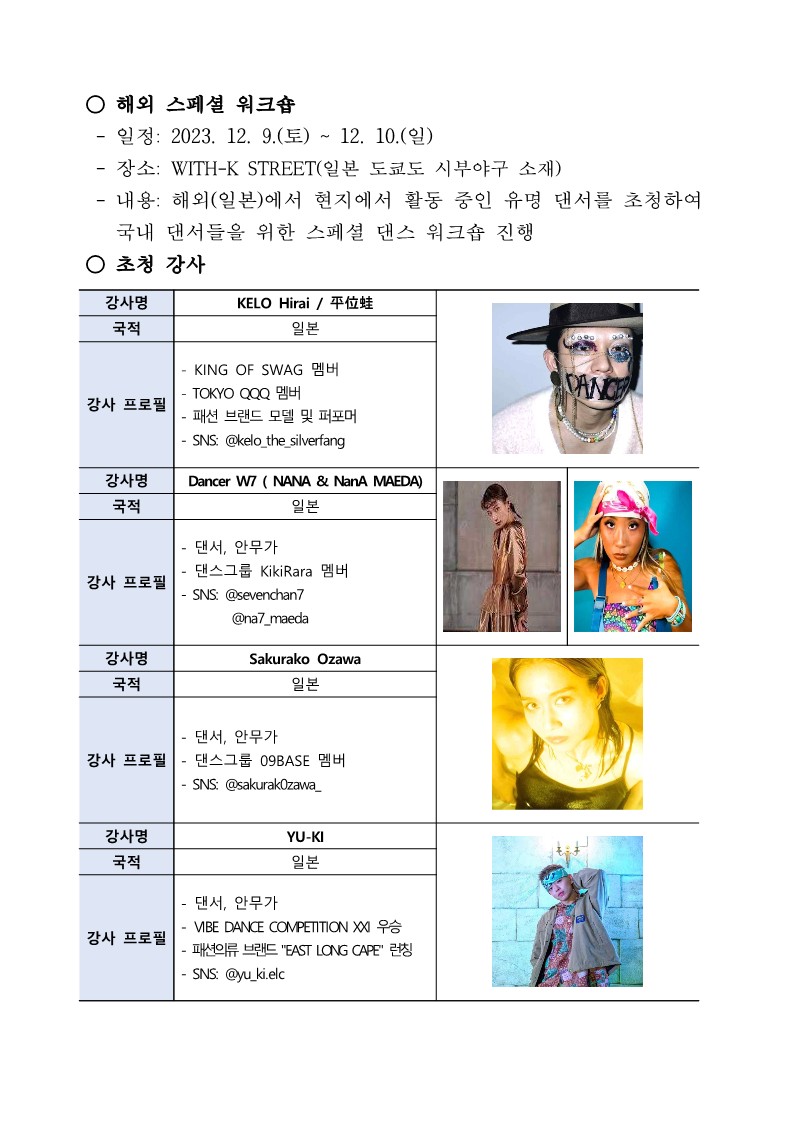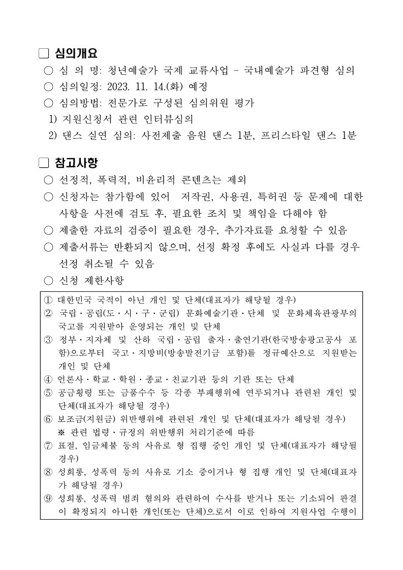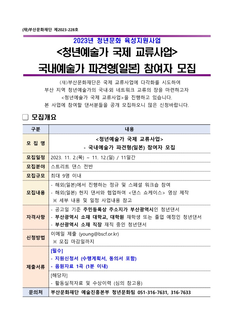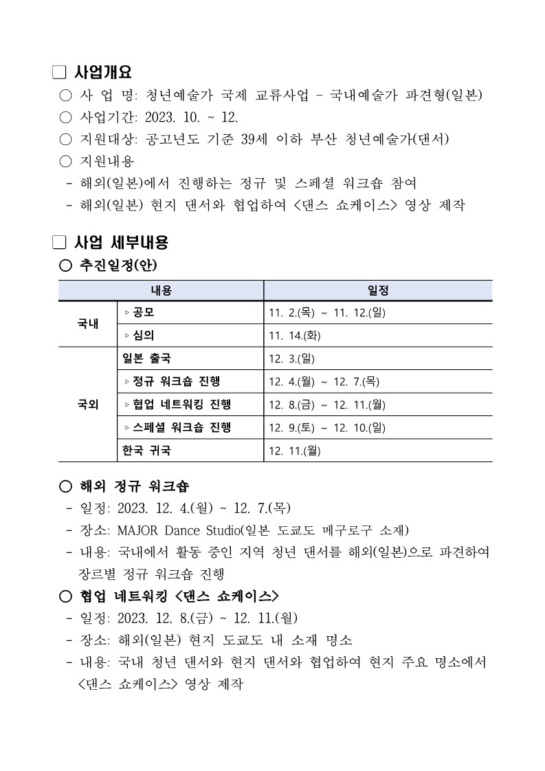 | 분야·대상 | 공고일 기준 주민등록상 주소지가 부산광역시인 청년댄서 | 인원 | 최대 9명 이내 |