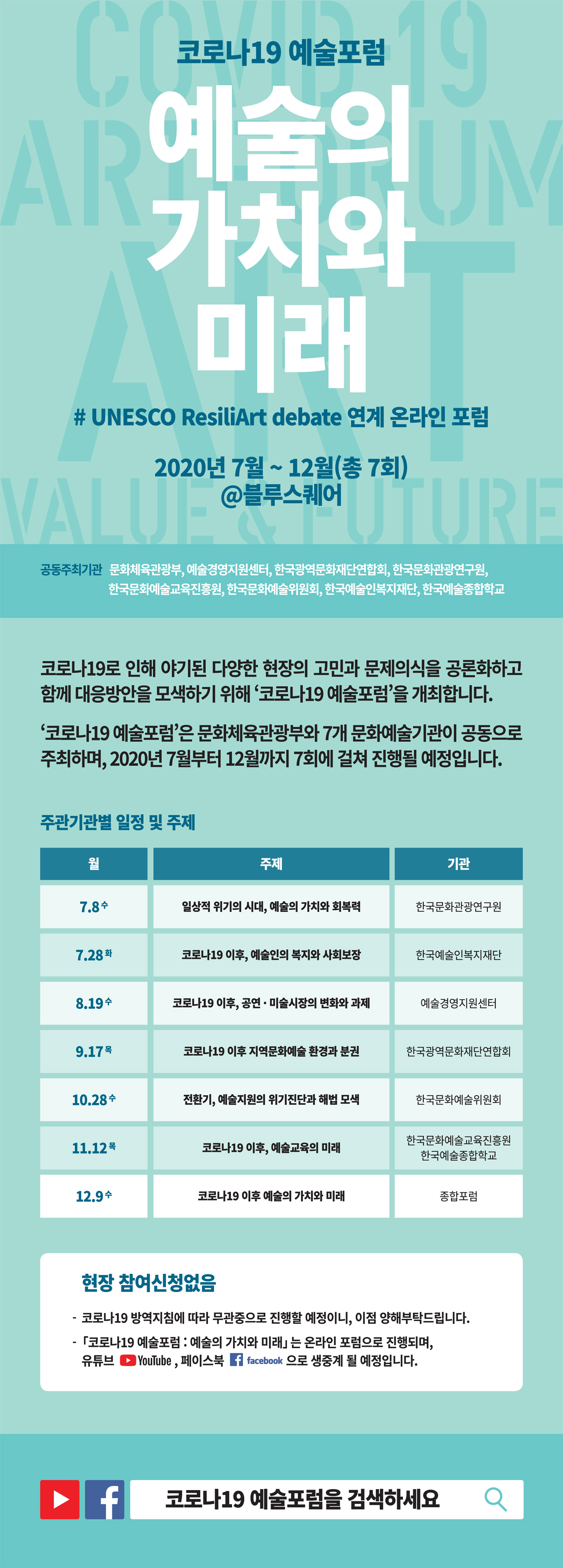 문화체육관광부와 산하기관이 공동 주관으로 코로나 19예술포럼을 하반기 총7회에 걸쳐 진행 예정입니다. 일정 참고 바라며, 온라인 생중계 후에는 영상으로도 확인 가능하니 관심 바랍니다.