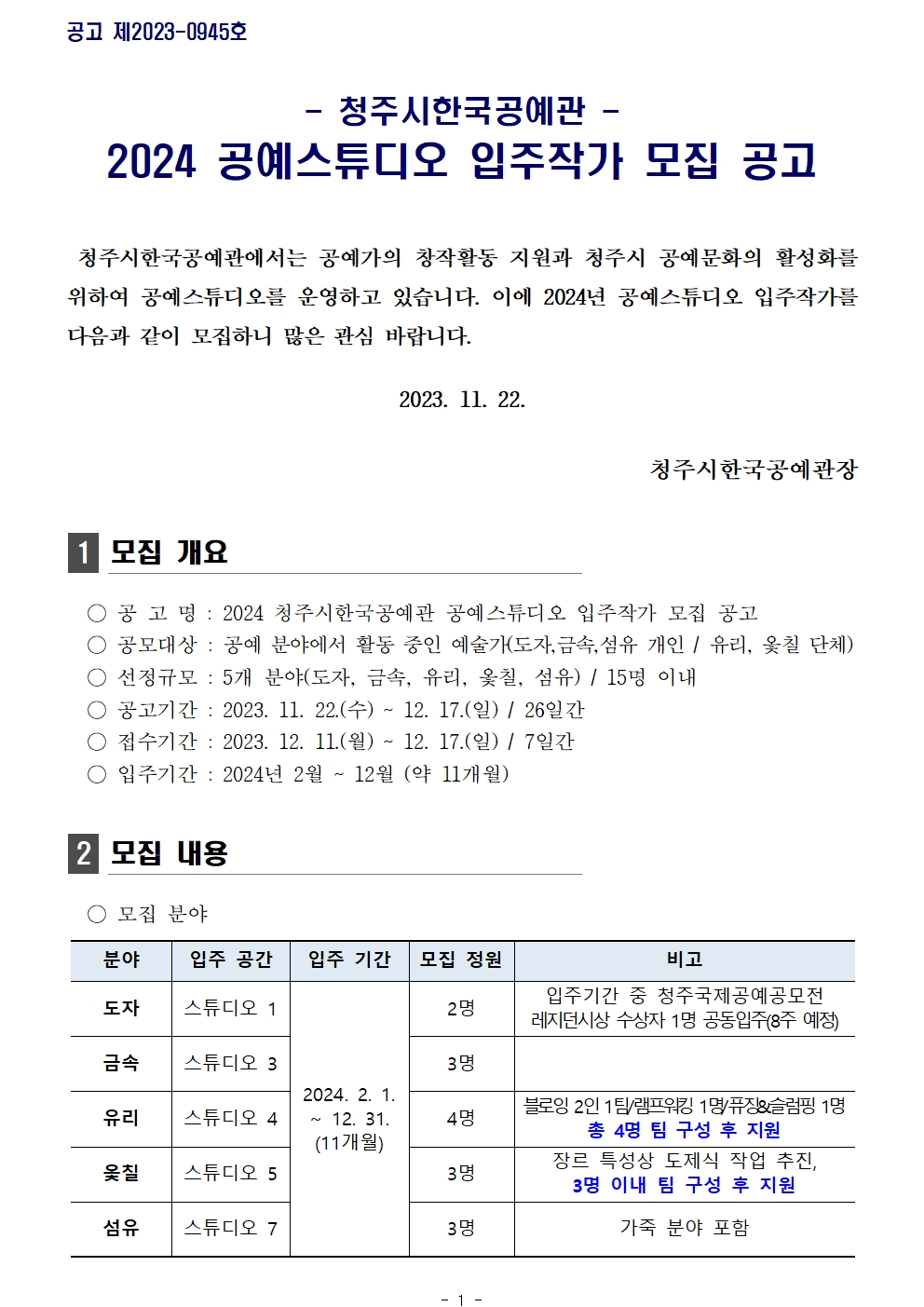 | 2024 청주시한국공예관 공예스튜디오 입주작가 모집 공고 | |||