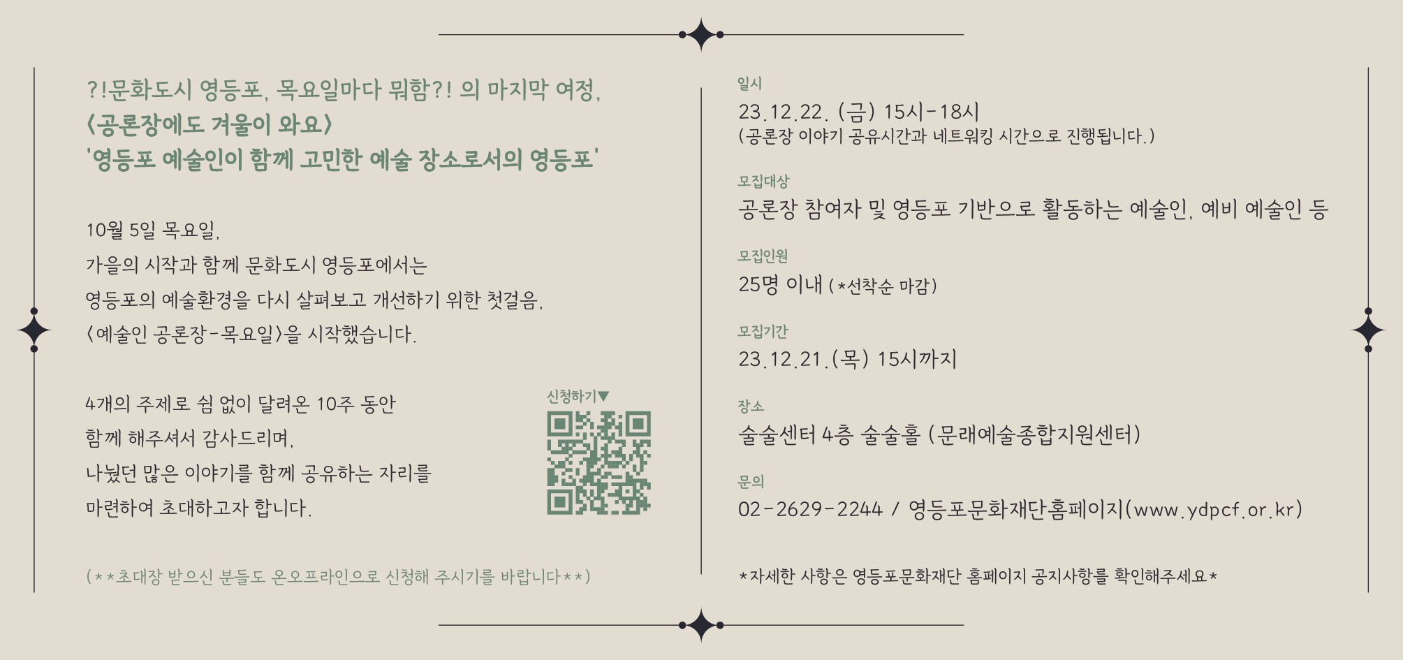 ?! 문화도시 영등포, 목요일마다 뭐함?! 의 마지막 여정 <공론장에도 겨울이 와요> '영등포 예술인이 함께 고민한 예술 장소로서의 영등포' 10월 5일 목요일, 가을의 시작과 함께, 문화도시 영등포에서는 영등포의 예술환경을 다시 살펴보고 개선하기 위한 첫걸음, <예술인 공론장-목요일>을 시작했습니다. 4개의 주제로 쉼 없이 달려온 10주 동안 함께 해주신 분들께 감사드리며, 나눴던 많은 이야기를 정리해보면서 더 많은 분들과 나누기 위한 자리를 마련하였습니다 : ) ★일 시: 12월 22일 (금) 15-18시 (공론장 이야기 공유시간과 네트워킹 시간으로 진행됩니다) ★모집대상: 공론장 참여자, 영등포 기반으로 활동하거나 영등포에서 활동하고자 하는 예술인, 예비 예술인 등 ★모집인원: 25명 이내(*선착순 마감) ★모집기간: 12월 21일 (목) 15시까지 ★장 소: 술술센터 4층 술술홀(문래예술종합지원센터) ★지원방법: 구글링크(https://url.kr/g2k6ap)를 통한 온라인 신청, 오프라인 신청 ★문 의: 02-2629-2244 / lyjkys5@ydpcf.or.kr