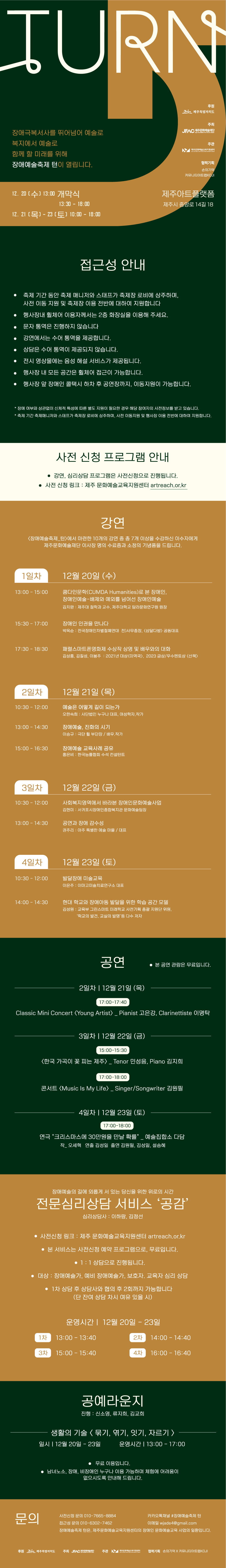 ![]() ![]() ■ 프로그램 일시 및 장소 - 12월 20일(수)~23(토) - 제주아트플랫폼 1층(제주시 중앙로 14길 18) ■ 참여대상: 도민, 장애인, 예술가 등 누구나 ■ 신청방법: 하단단에 구글 링크 클릭하여 신청자 정보 입력 후 제출 - 프로그램 신청 시 여러명 신청 하실 경우 인원 1명당 개별로 신청바랍니다! (ex. 3명 신청 시 3명 각각 따로 제출) ■ 신청링크: - 강연: ▶ [강연 신청 링크] - 공연: ▶ [공연 신청 링크] - 심리상담: ▶ [심리상담 신청 링크] ■ 신청마감: 모집인원 충족 시 마감 (※ 공연 당일 현장접수 동시 진행) ■ 안내사항 - 신청 마감 전 모집인원이 모두 충원되면 조기마감 될 수 있습니다. - 본 신청폼 작성 후 프로그램 참여가 자동 확정되지 않으며, '참여 확정' 안내 문자를 받으셔야만 확정됩니다. - 사전 연락없이 불참 시 향후 제주문화예술재단에서 진행하는 타 행사에 참석 제한이 있을 수 있습니다. ■ 문의처 : 064-800-9173