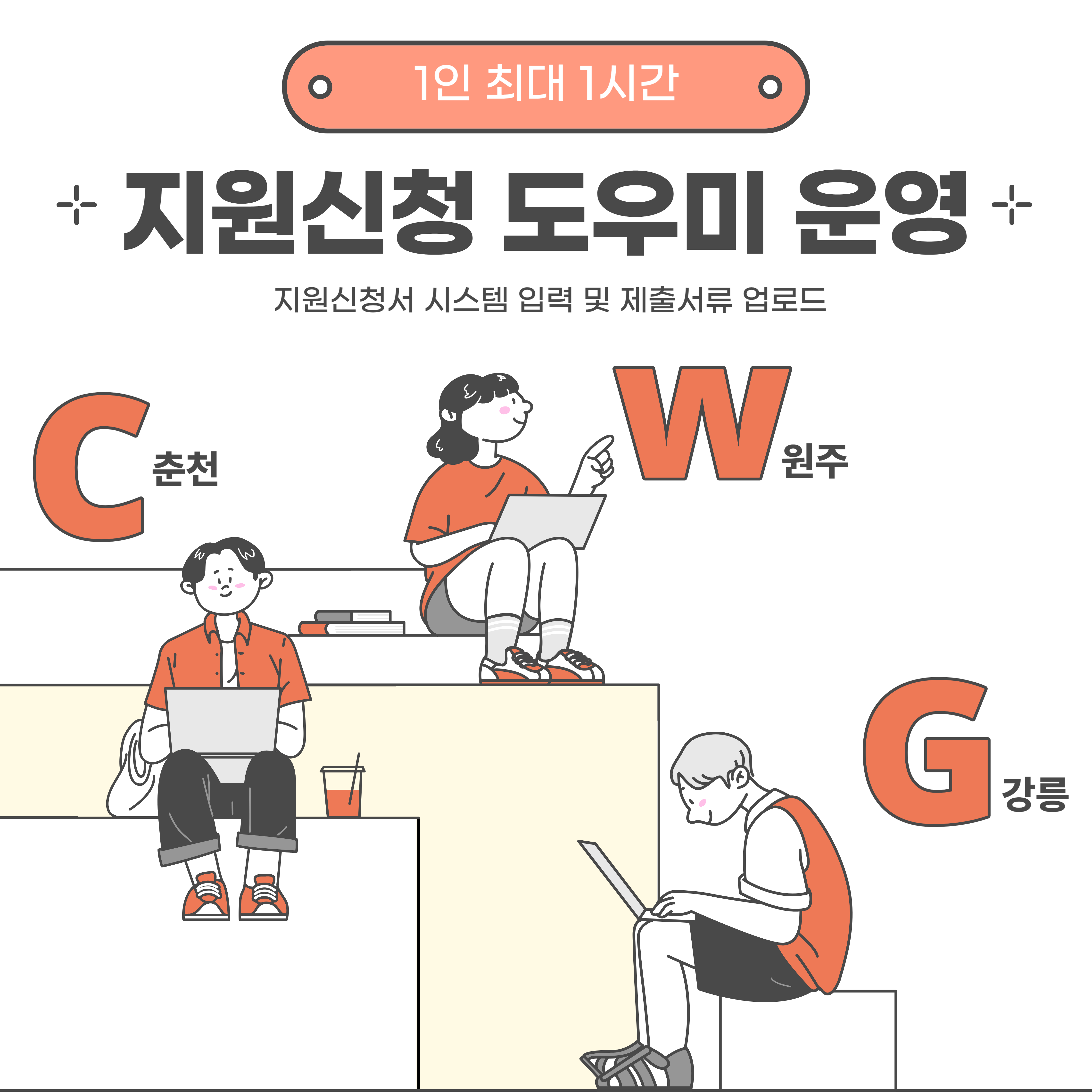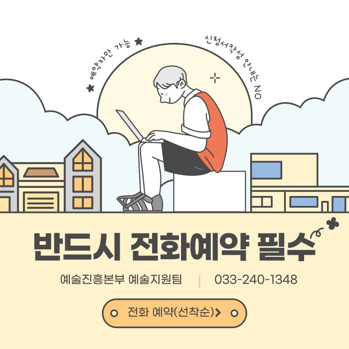 ※ 지원신청서 작성내용에 대한 안내는 불가하며, 지원신청서 시스템 입력 및 제출서류 업로드만 도와드립니다. 전화예약 필수 1인 최대 1시간 선착순예약자에 한해 진행됩니다. 전화예약(선착순) : 033-240-1348