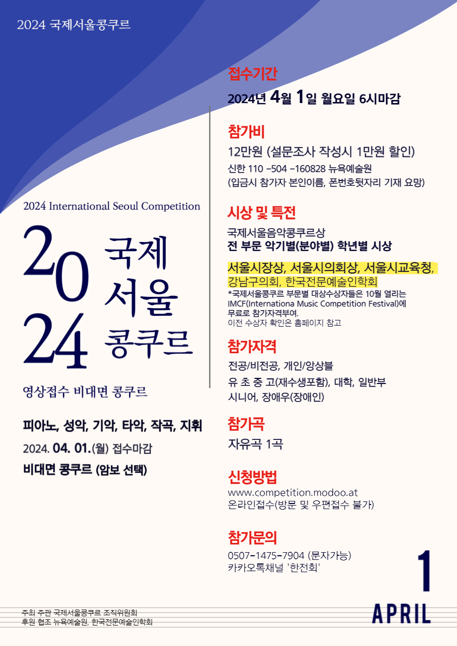 | <2024년 상반기 국제서울콩쿠르> ~4월1일 마감. 서울시장상 등 음악콩쿨 음악콘테스트 | |||