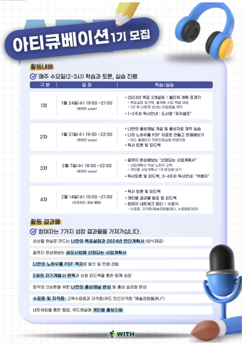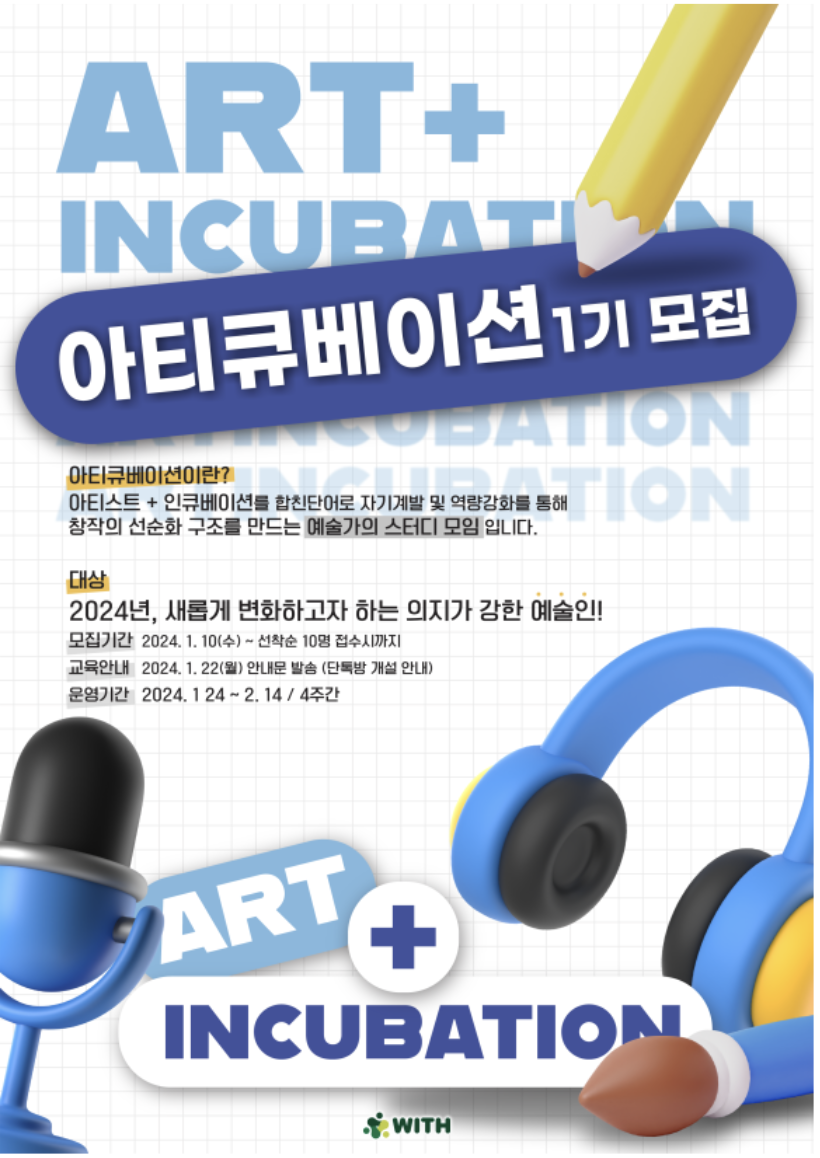 위드가 올해 역량강화를 통해 변화와 성장을 희망하는 예술인과 함께하는 아티큐베인션과정을개설해서 1기 모집중입니다. 많은 관심과 참여 부탁드립니다. 감사합니다.
