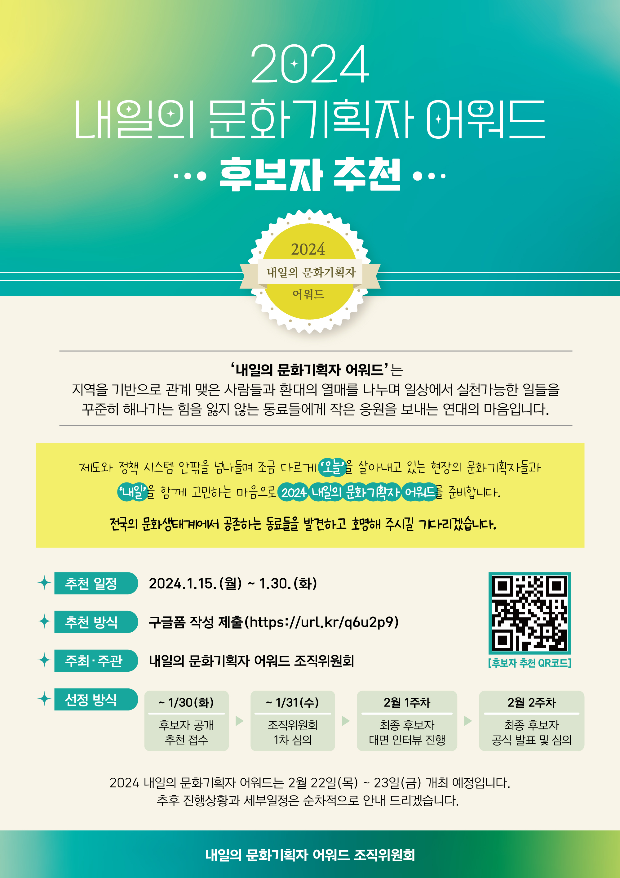 ![]() [2024 내일의 문화기획자 어워드 후보자 추천] ‘내일의 문화기획자 어워드’는 지역을 기반으로 관계 맺은 사람들과 환대의 열매를 나누며 일상에서 실천가능한 일들을 꾸준히 해나가는 힘을 잃지 않는 동료들에게 작은 응원을 보내는 연대의 마음입니다. 제도와 정책 시스템 안팎을 넘나들며 조금 다르게 ‘오늘’을 살아내고 있는 현장의 문화기획자들과 ‘내일’을 함께 고민하는 마음으로 2024 내일의 문화기획자 어워드를 준비합니다. • 추천 일정 : 2024년 1월 15일(월) - 1월 30일(화) • 추천 방식 : 구글폼 작성 (https://han.gl/9dqf9) • 주최주관 : 내일의 문화기획자 어워드 조직위원회 전국의 문화생태계에서 공존하는 동료들을 발견하고 호명해 주시길 기다리겠습니다. *세부 일정과 방식은 홍보물 참조 부탁드립니다.