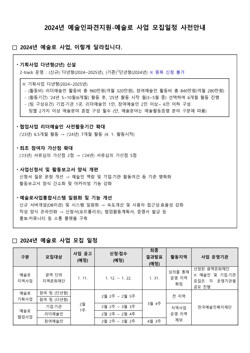 | [안내] 2024년 예술인파견지원-예술로 사업 모집일정 사전안내 | |||