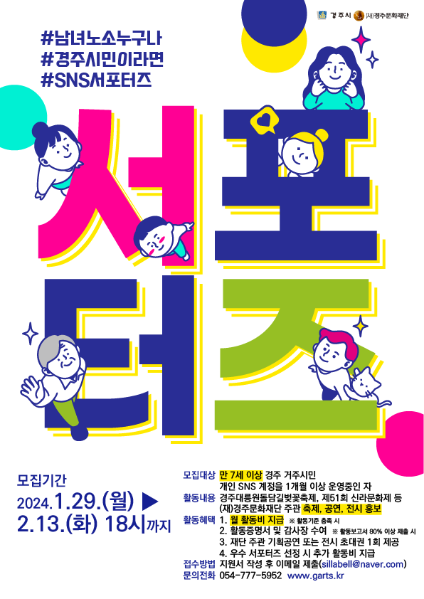 (재)경주문화재단이 주관하는 경주의 축제와 문화를 알리고, 함께 즐기고 싶은 <시민 SNS 서포터즈>를 모집하오니 많은 관심과 참여 바랍니다!