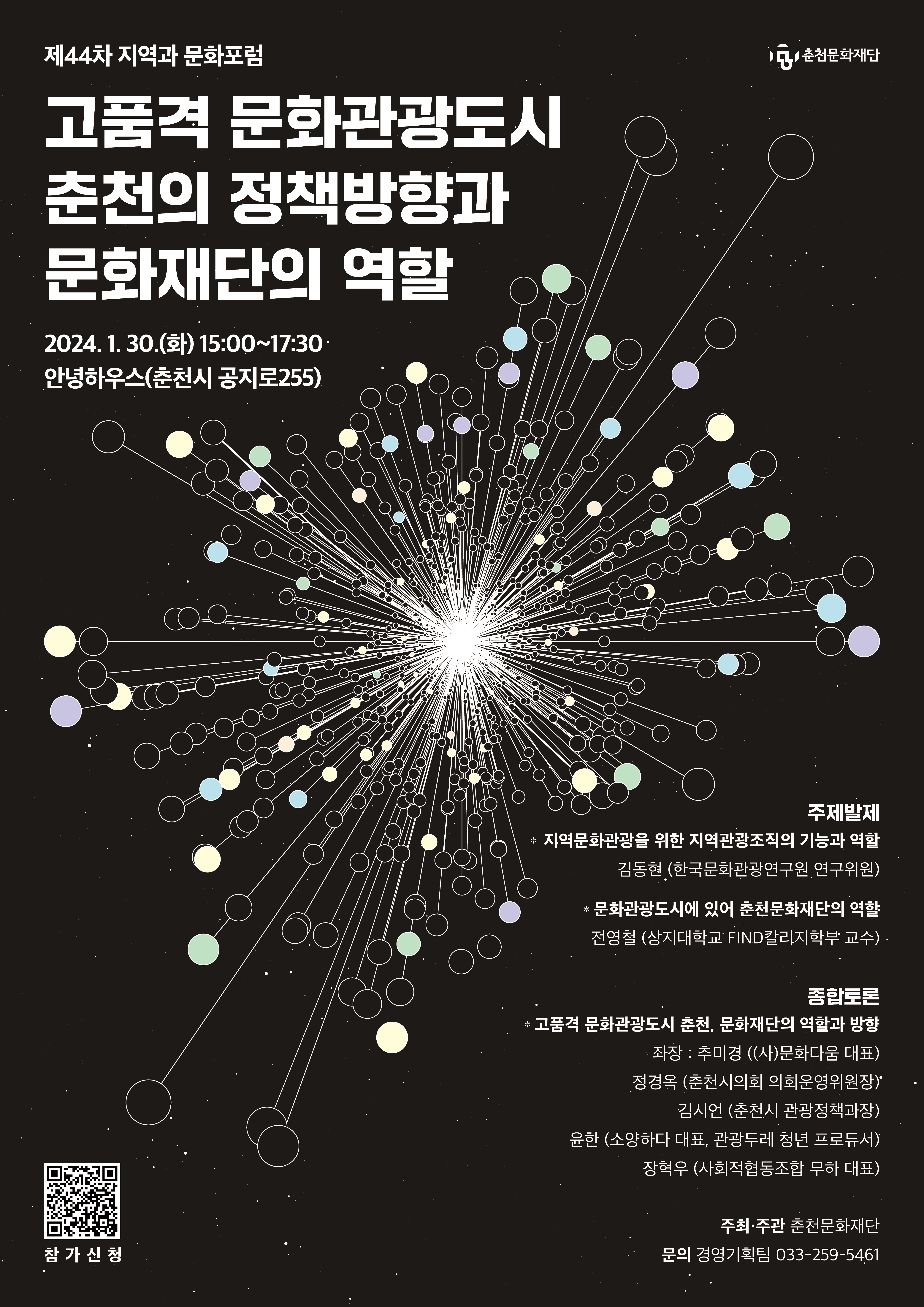 시책과 아울러 춘천문화재단의 역할과 방향에 대해 자유로이 논의하는 본 포럼에 많은 관심과 참여 부탁드립니다.