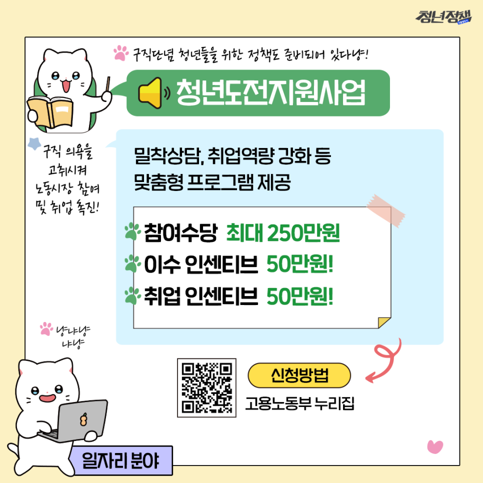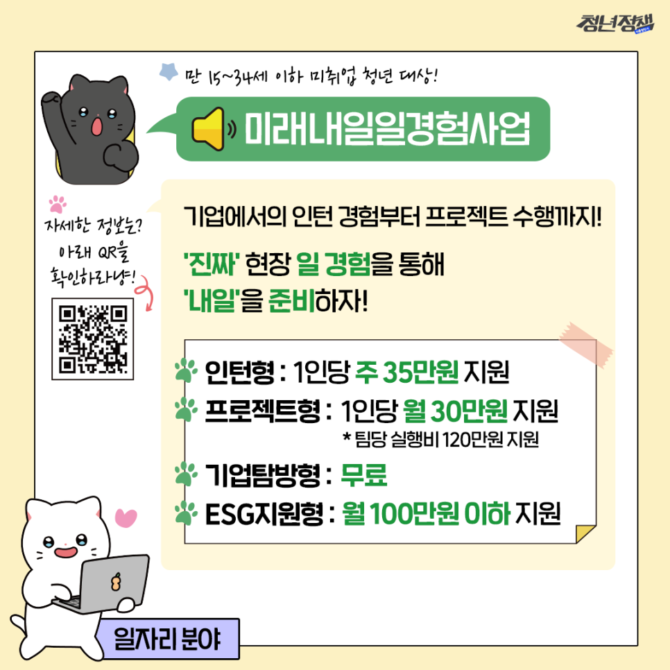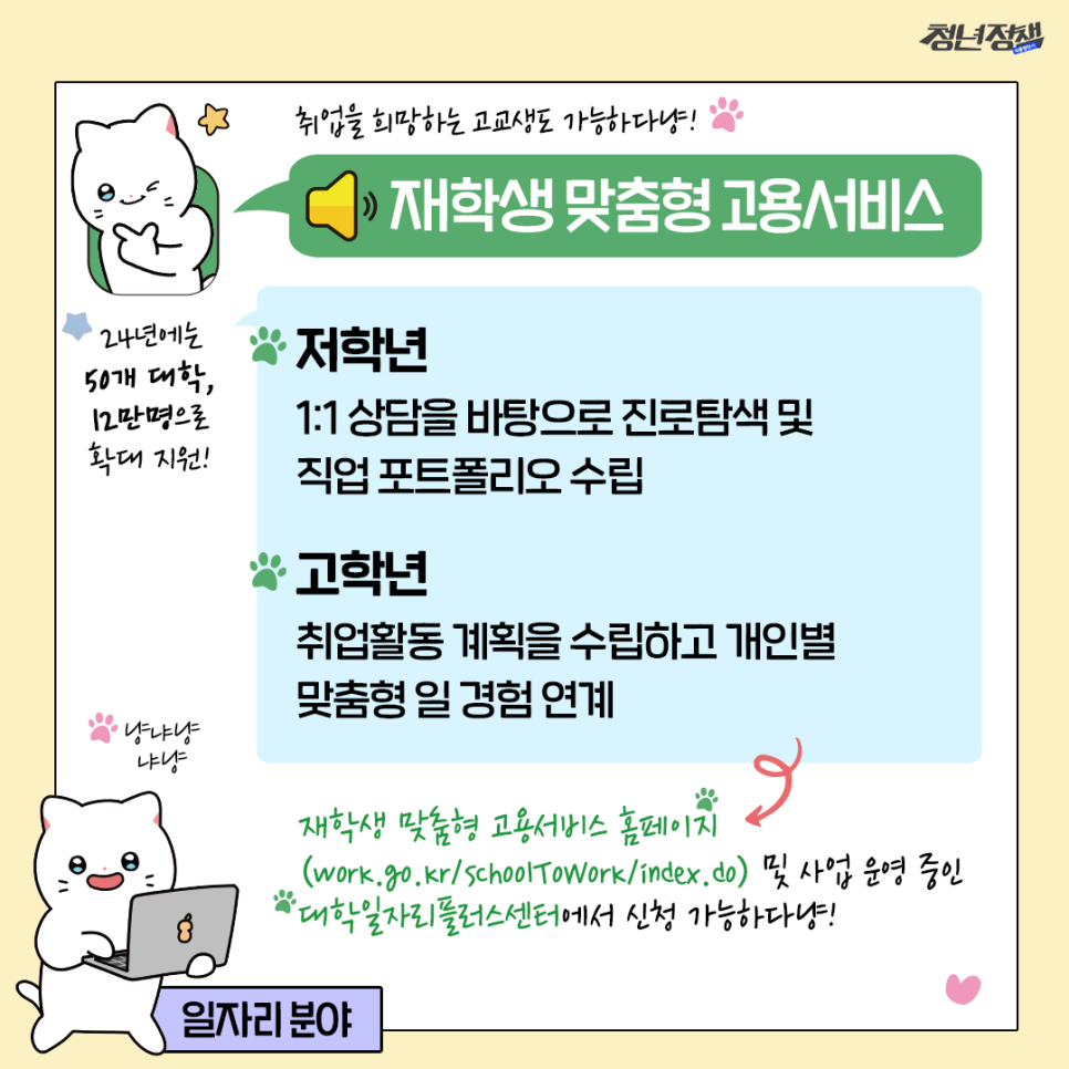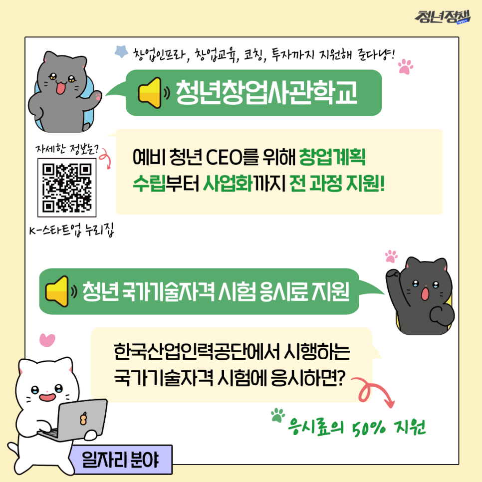 2024 꼭 알아야 할 청년정책_ 일자리 분야 미래내일일경험사업 ![]() 재학생 맞춤형 고용서비스 ![]() 재학생 맞춤형 고용서비스 홈페이지 청년인턴 ![]() 나라일터 누리집 https://www.gojobs.go.kr/mainIndex.do 청년창업사관학교 ![]() K-스타트업 누리집 https://www.k-startup.go.kr/ 청년 국가기술자격 시험 응시료 지원 > 한국산업인력공단에서 시행하는 국가기술자격 시험에 응시하면? 응시료의 50% 지원!