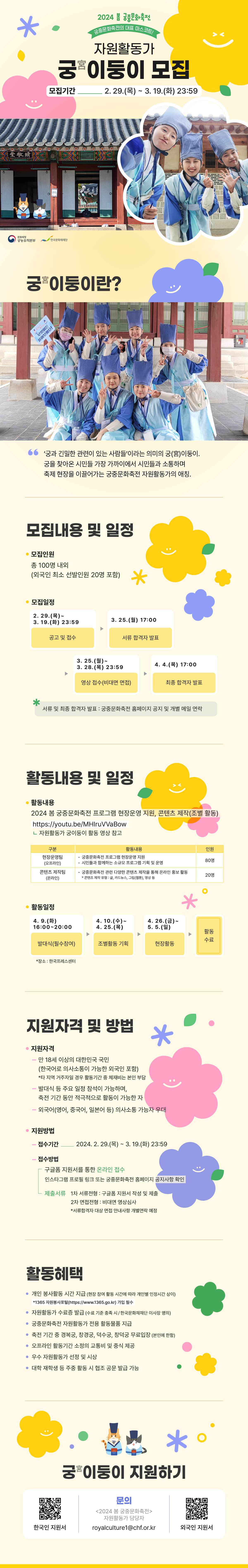 6. 문의 : <2024 봄 궁중문화축전> 자원활동가 담당자(02-3210-4635) / royalculture1@chf.or.kr