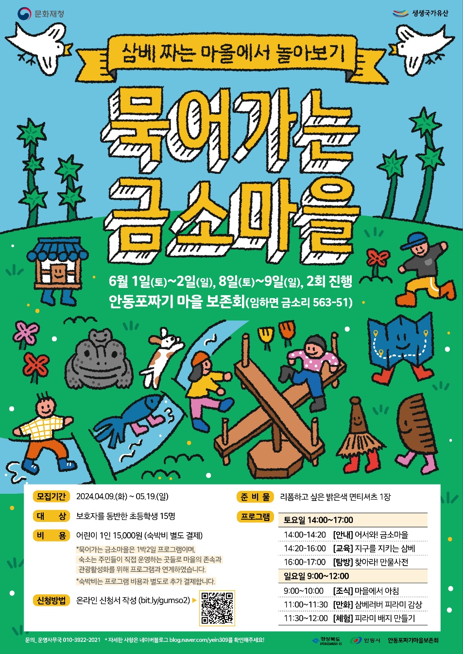 ![]() 안동의 전통을 간직한 금소마을로 놀러오세요 고즈넉한 시골 마을에서 다양한 활동을 하고 싶은, 기후위기 시대 환경문제에 관심이 있고, 우리 전통문화에 대해 궁금한 점이 많은, 아이와 함께 새로운 여행을 하고 싶은 가족들을 찾습니다! 묵어가는 금소마을은 기후위기 시대 우리나라 삼베의 가치에 조명하며 슬로우패션을 배우고, 삼베짜는 금소마을에서 자고 먹고 놀면서 마을의 소중함을 경험하는 1박2일 체험여행입니다. 금소마을은 삼베 중에서도 가장 높은 품질의 안동포를 짜는 전통을 보존하고 있습니다. 한옥을 많이 간직하고 있는 마을의 풍경은 삼베만큼이나 정갈하고 곱습니다. 단아한 한옥을 담은 금소마을에서 묵어가며 안동포를 배우고, 봇도랑을 만나며 마을을 여행해보세요 자세한 내용은 blog.naver.com/yein309에서 확인해주세요