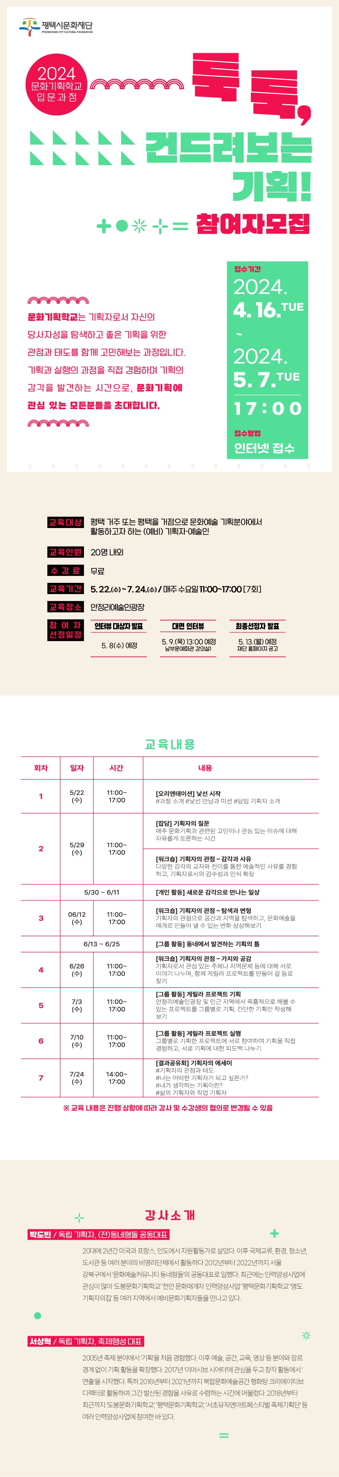 | 분야·대상 | 평택 거주 또는 평택을 거점으로 문화예술 기획분야에서 활동하고자 하는 (예비) 기획자/예술인 | 인원 | 20명 내외 |