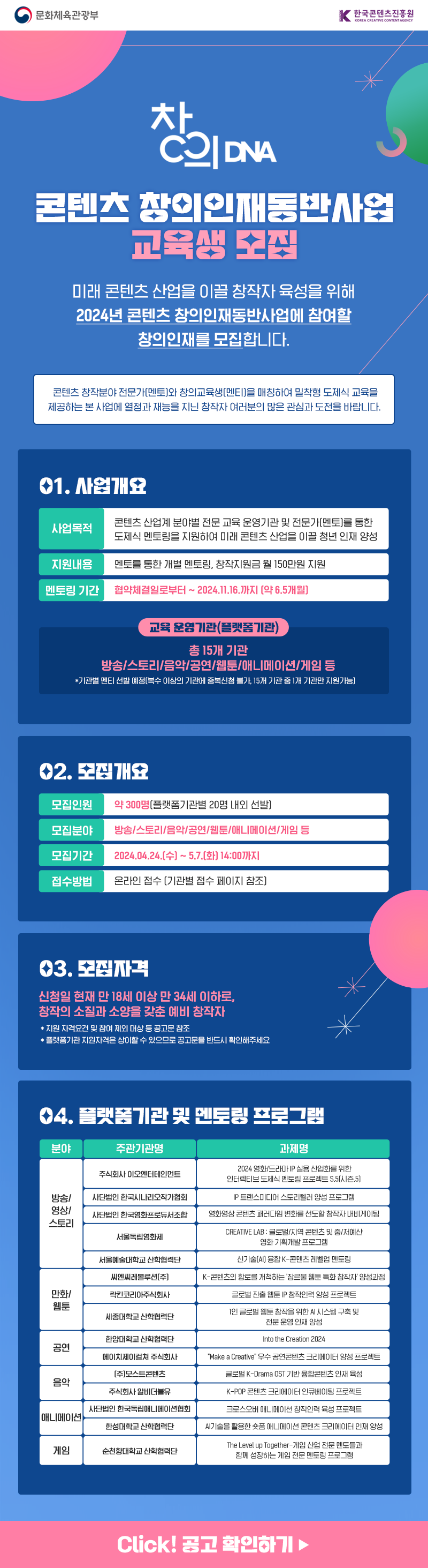 | 2024년 콘텐츠 창의인재동반사업 창의교육생 모집 (4.24 ~5.7) | |||