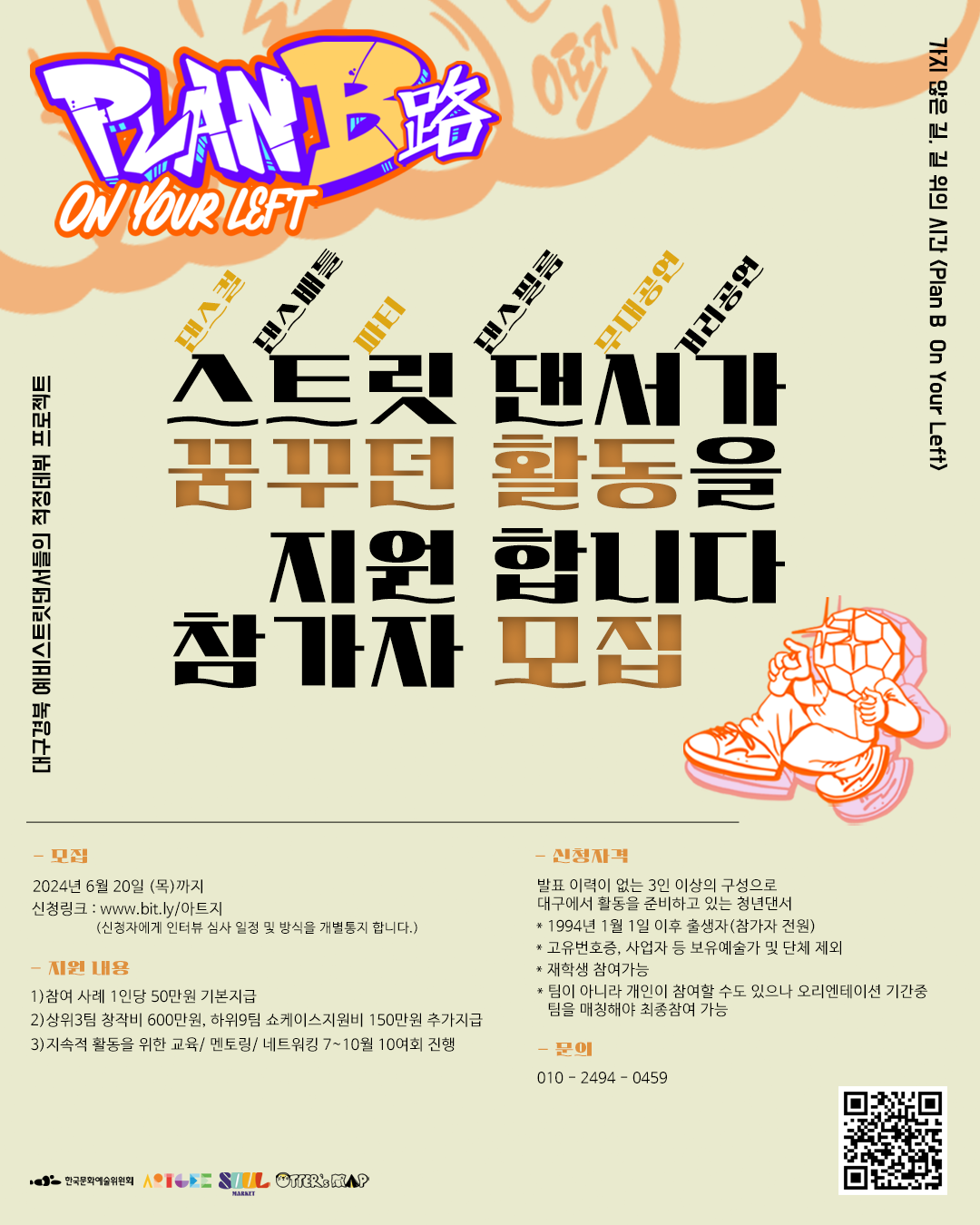 ![]() 대구경북 예비 스트릿 댄서들의 적정데뷔 프로젝트 : 가지 않은 길, 길 위의 시간 < Plan B_On Your Left > _ 스트릿 댄서들이 하고 싶은 모든일, 당신이 미뤄두었던 - 꿈꾸던 활동들을 함께 방법을 찾아 할 수 있게 해드립니다. (활동비, 창작비, 전문가 매칭, 공간-장비, 기획, 협업, 홍보, 유통...등) • 모집기간 2024년 6월 20일(목)까지