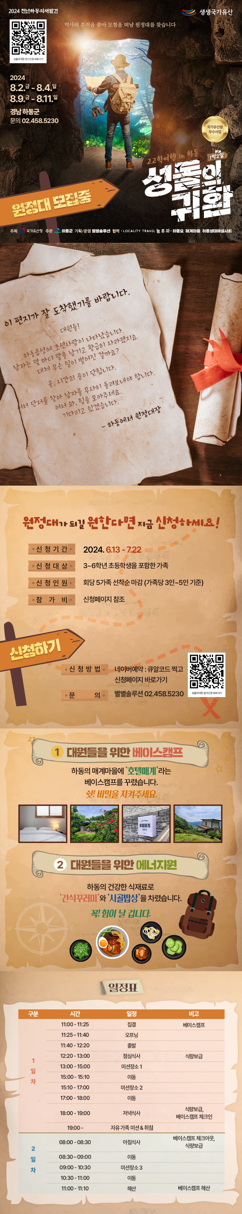| 대원들! 하동읍성에 '시간의 문'이 열리고 조선의 '사기장'이 나타났습니다. 게다가 누군가에게 쫓기고 있습니다. 2024년의 하동에 도대체 무슨 일이 벌어진 걸까요? 속히 하동으로 와주십시오! 지혜를 모아 미션을 수행하고, 사기장을 구출해 조선으로 돌려보내야 합니다. 기다리고 있겠습니다. ![]() -----------------< 참가신청 안내>----------------- 하동에서 1박2일간 펼쳐지는 역사미션투어 <성돌의 귀환>에 모험심 가득한 '원정대원'을 아래와 같이 모집하고 있습니다. ● 신청회차 - 1차 : 8월 2일(금) ~ 8월 3일(토) - 2차 : 8월 3일(토) ~ 8월 4일(일) - 3차 : 8월 9일(금) ~ 8월 10일(토) - 4차 : 8월 10일(토) ~ 8월 11일(일) --> 마감 ● 신청대상 : 초등학생(3~6학년)과 그 가족 ● 신청인원 : 회당 5가족 (3인~4인 기준) ● 참가비용 : 28만원(1독채 기준, 3~4인 가족 동일) - 제공사항 : 가족별 매계마을 독채주택, 1박2일 프로그램 및 이동차량, 식사(점심/저녁/아침), 원정대키트, 여름용품, 간식꾸러미, 여행자보험 - 5인 이상 예약을 희망할 경우 사전 전화문의 후 신청바라며, 사전 문의 없이 신청할 경우 숙소 수용 상태에 어려움이 있어 참가확정이 불가할 수 있음(참가비는 1독채 기준, 33만원) - 사회적 약자 가족에 한해 회당 1가족씩 무료 참가 가능(선착순 마감)하며, 사회적 약자란 저소득층(중위소득 65% 이하), 장애인, 한부모가족 지원법에 의한 보호대상자, 북한이탈주민, 결혼이민자로 신청 이후 참가 확정 과정에서 증빙이 필요함 ● 신청링크 : 네이버 https://naver.me/xVBtSwAd ● 신청문의 : 02-458-5230 별별솔루션 -----------------< 꼭 읽어주세요 >----------------- 1. 참가연령 제한 안내 - 원활한 활동을 위해 ‘초등학생(3~6학년)’을 포함한 3인~5인의 가족 기준으로 신청해주세요. - 안전한 외부활동을 위해 대상 외 자녀의 연령은 6세 이상이어야 합니다. 2. 부득이한 행사 취소 및 조정 안내 - 전체 야외프로그램으로 행사 진행이 어렵다고 판단되는 유사(감염병, 재해, 폭염 등) 시, 부득이하게 취소 또는 조정될 수 있습니다. - 8월초 바캉스 시즌에 진행되나 한여름 폭염으로 활동이 어려워 조정이 있을 수도 있습니다. 3. 참가확정 안내 - 네이버폼의 신청양식이 운영사가 원하는 방식과 다른 관계로 신청 '응답일시' 기준으로 '선착순 마감' 됩니다. - 여러 회차에 걸쳐 '중복신청'하는 것은 인정되지 않으므로 중복신청자께서는 02-458-5230으로 전화 및 조정 문의하셔야 불이익을 피할 수 있습니다. - '참가 확정된 가족'에 대해서는 참가 확정 및 참가비 등 별도의 안내를 보내드리며, '카카오톡 단톡방'으로 초대되오니 어플 설치 및 사용 현황을 확인해주시기 바랍니다. 4. 취소 및 환불 안내 - 소수(회당 5가족)가 참여하는 프로그램이므로 모두가 즐겁고 원활한 여행이 되도록 참가신청 및 취소 결정을 신중히 해주시기 바랍니다. - 프로그램 참여일 기준으로 취소일자에 따라 아래와 같이 취소수수료가 부과됩니다. * 불가항력적인 천재지변에 한해 전액 환불 * 숙소 예약 변경 불가 및 여행자보험 가입이 진행되는 시점으로 7일전~3일전 50%, 3일전~2일전까지 70% 수수료 부과 * 참여 1일전 환불 불가