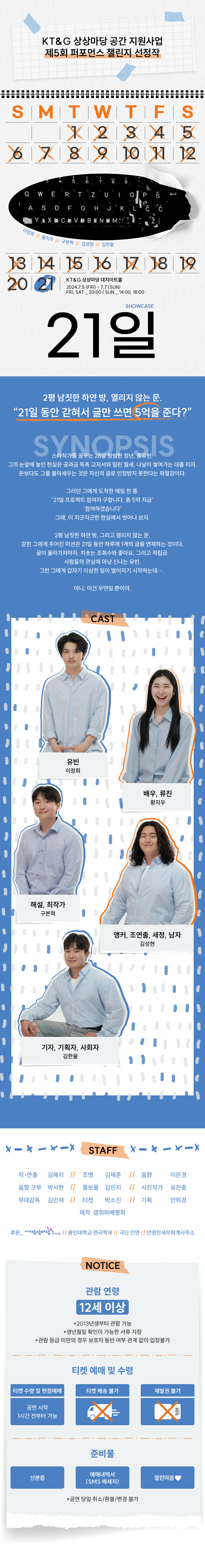 | 연극 <21일> 쇼케이스 - KT&G 상상마당 공간 지원사업 제5회 퍼포먼스 챌린지 선정작 | |||