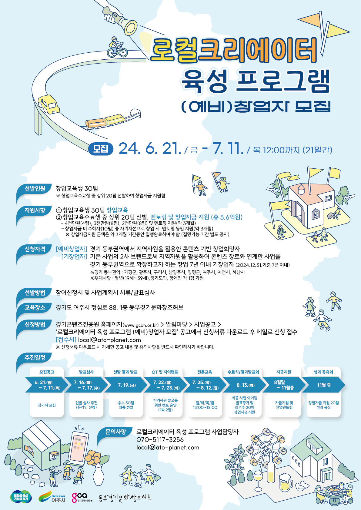 ‣ 상단 제출서류 항목을 1개의 파일로 압축하여 업로드 ※ 파일명 : 지원기관명(또는 프로젝트명).zip ‣ 인감이 필요한 서류에는 반드시 인감 날인 후 스캔하여 제출 8. 기타사항 가. 가점 증빙자료를 제출하지 않으면 가점 반영 불가 나. 동점자 발생 시 심사 배점이 높은 항목으로 순위 부여 다. 공고 및 사업안내서에 별도로 정하지 아니한 사항에 대하여는 사전 문의 9. 유의사항 가. 지역자원을 활용하지 않는 단순 식당이나 카페, 관광 관련 창업은 지원하지 않음. 나. 창업자금지원 수혜자로 선발된 인원은 반드시 자금지원협약 체결시 까지(8월말 예정) 신규 사업자등록 또는 지점 사업자등록 완료해야하며, 자금교부이후 11월중순까지 지원자금 일체에 대한 집행을 완료하여야 함.(미집행금액 또는 불인정금액은 환수조치함) 다. 경기콘텐츠진흥원 중복지원기업제한 운영 관리 지침(중복수혜자 지원 배제) ○ 적용대상 : 기업지원사업 중 현금 지원 제작지원사업 ○ 제한내용 - 당해연도 기준 기업별 지원과제수는 최대 2개로 제한함. 단, 2,500만원 이하의 과제는 과제수에서 제외함 - 당해연도 포함 최근 3년간(당해연도 지원금액 포함) 기업별 지원과제금액의 합계는 6억 이하로 제한함. 단 타 기관사업은 제외함. 라. 기타 지원 배제 및 지원금 환수 - 동일과제로 경기콘텐츠진흥원 사업 및 타 기관사업의 수혜자는 지원 배제함. - 이미 완료된 프로젝트를 지원신청한 경우 지원 배제함. - 정부 및 유관기관으로부터 참여제한 조치를 받고 있는 사업자의 경우 지원 배제함. - 지원 배제사유에 해당하거나 지원과제(프로젝트) 내용 등에 대하여 허위로 작성하여 발각된 경우 지원을 즉시 중단하며, 지원금이 지급되었을 경우 지원금은 전액 환수함. - 자금지원협약 이후 협약 해지 요건이 발생할 경우 지원금은 전액 환수함. 마. 모집공고 내용을 인지하지 못하여 지원 배제 사유가 발생할 경우, 귀책사유는 당사자에게 있음. 10. 문의처 가. ‘로컬크리에이터 육성 프로그램’ 사업담당자 - 전화 : 070-5117-3256 - Email : local@ato-planet.com 나. 문의시간 : 평일 09:00~18:00 위와 같이 공고합니다. 2024. 6. 21.