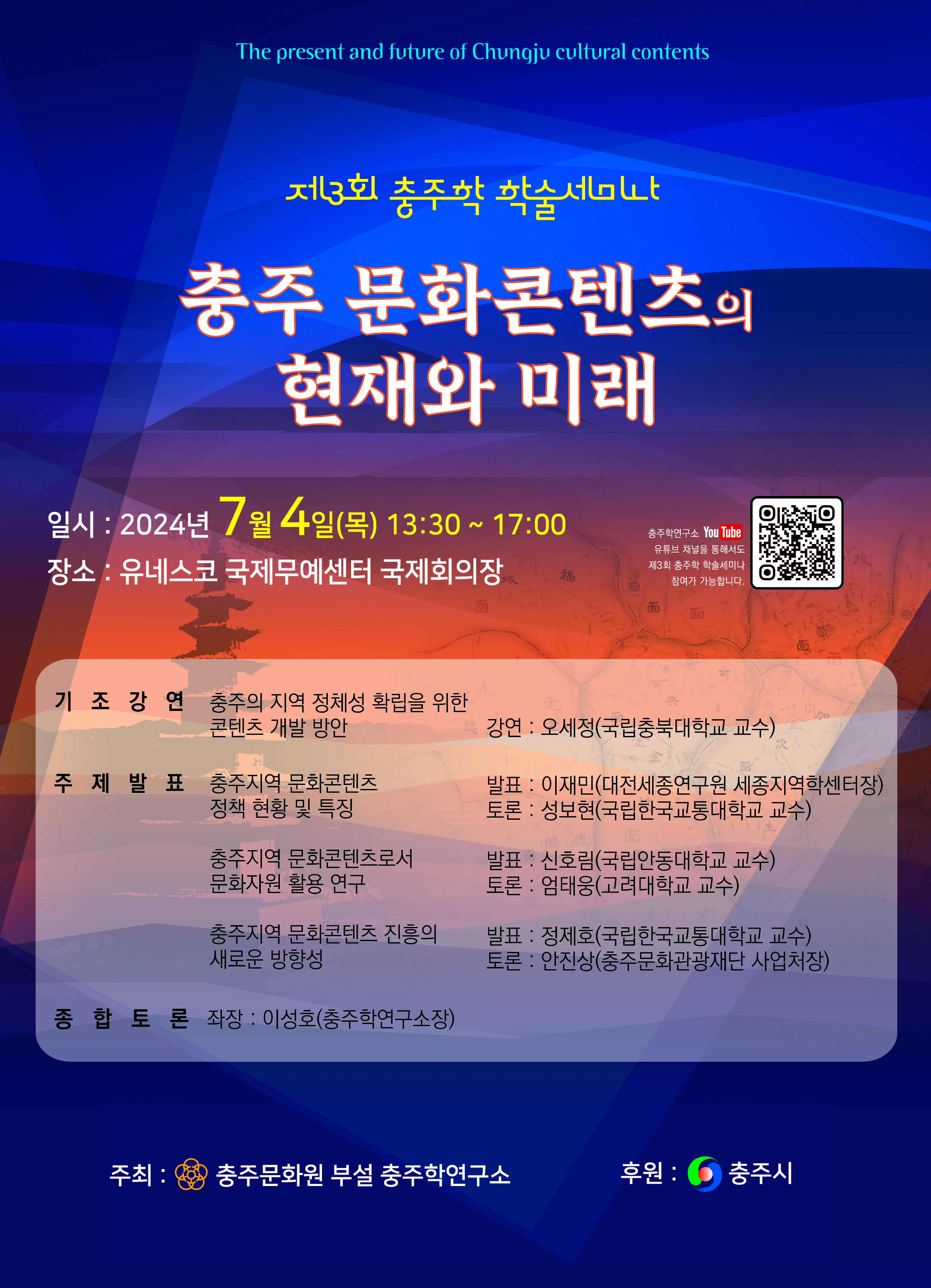 [식전행사] - 축사 [기조강연] 강연 : 오세정(국립충북대학교 교수) [주제발표] - 충주지역 문화콘텐츠 정책 현황 및 특징 발표 : 신호림(국립안동대학교 교수) 토론 : 엄태웅(고려대학교 교수) - 충주지역 문화콘텐츠 진흥의 새로운 방향성 발표 : 정제호(국립한국교통대학교 교수) 토론 : 안진상(충주문화관광재단 사업처장) [종합토론] - 좌장 : 이성호(충주학연구소장)