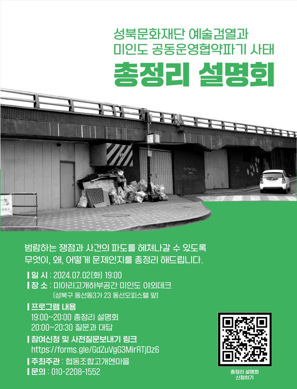 일시 : 2024.07.02(화) 19시 장소 : 미아리고개하부공간 미인도 야외데크 (성북구 동선동3가 23 동선오피스텔 앞) 참여신청 및 사전 질문 보내기 링크 https://fms.gle/6QoV4A2Y6T7UjQTQ9 성북문화재단 예술검열과 주민내쫓기 자세히 알아보기 https://blog.naver.com/hillnvill/223485308536