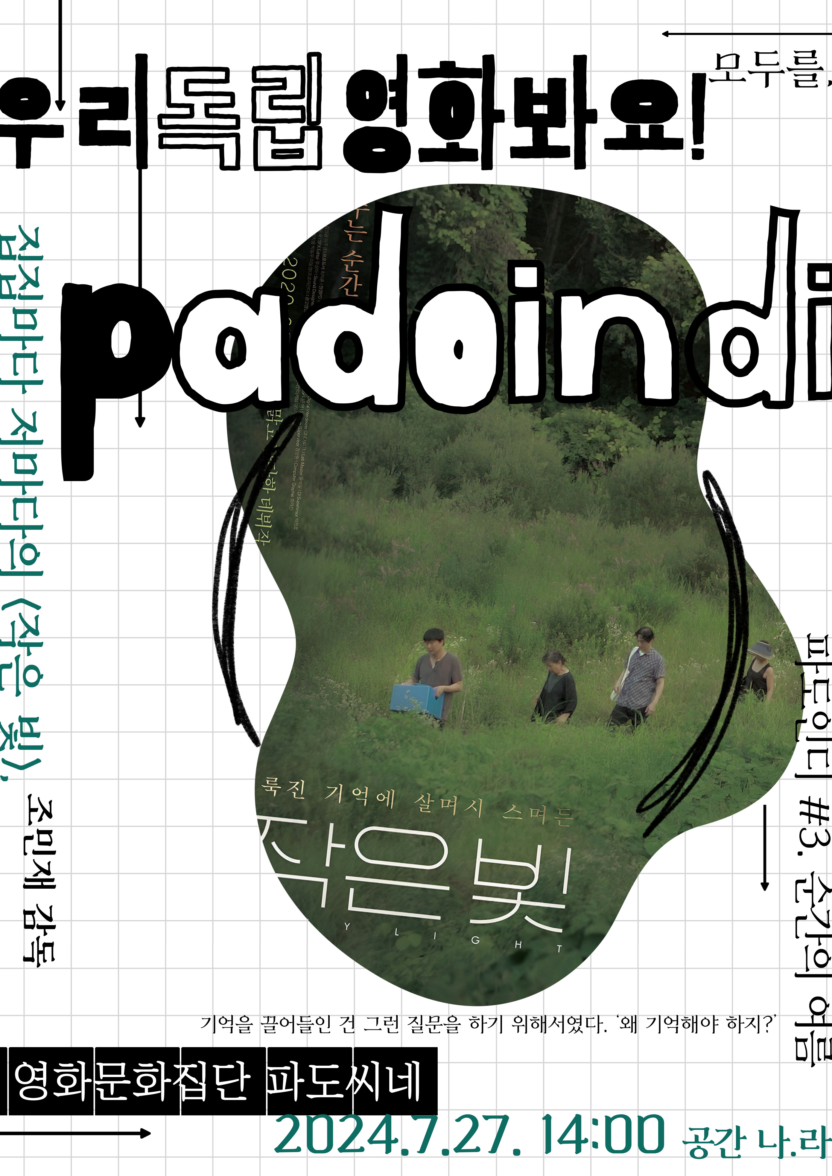 일시 : 7월 27일 토요일 오후 2시 (10분 전까지 착석부탁드려요) 장소 : 광안동 공간 나.라(수영로513번길 18) 영화 : 작은 빛(조민재) 91min 참가비 : 8,000원(입금계좌는 신청링크 참고)