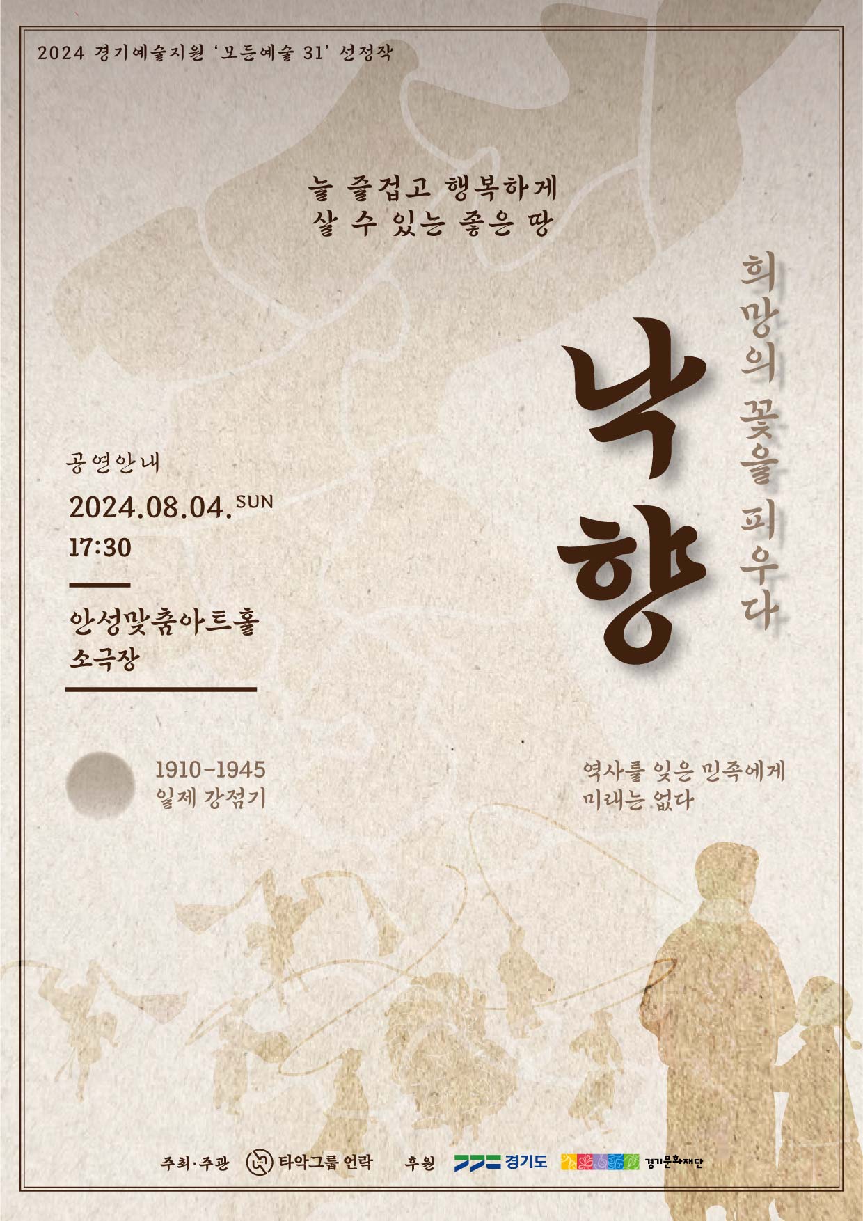 ![]() ▶시놉시스 일제의 억압과 공포에도 불구하고 반만년 유구한 역사와 수많은 전통문화유산을 지켜낸 선조들의 이야기. 일본의 억압과 문화 강요에 맞서 조선의 문화와 정체성을 지키며 희망을 노래하는 이들의 용기와 투쟁이 공감과 감동으로 어두운 역사 속에서도 빛나는 희망의 메시지를 전달하며 관객에게 애환과 희망을 선사하는데.. ▶프로그램 개요 - 작품명 : 역사 연희극 <낙향 : 희망의 꽃을 피우다.> - 일시 : 2024.08.04(일요일) 17 : 30 - 장소 : 안성맞춤아트홀 소극장 (경기 안성시 발화대길 21 안성맞춤아트홀) - 관람료 : 전석무료 - 러닝타임 : 약 60분 ▶예매 기간 - 사전예매 : 2024.07.23(화) ~ 08.04(일) - 현장예매 : 2024.08.04(일) 안성맞춤아트홀 소극장 로비서 예매 ▶예매 방법 - 하단 링크 첨부 ☎문의 - 010-2039-7144