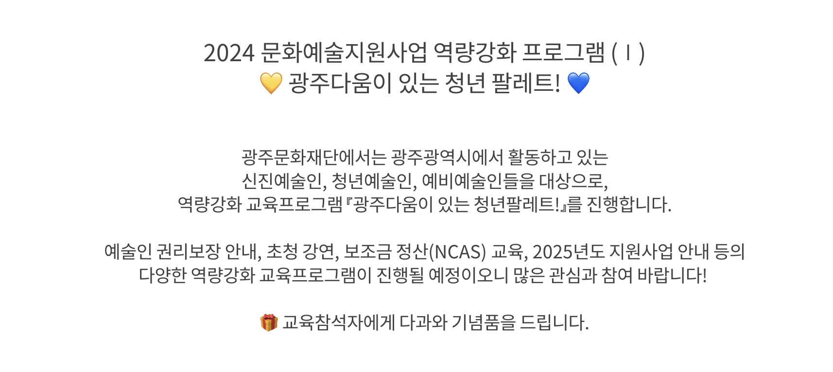 | 분야·대상 | 광주광역시에서 활동하는 신진예술인, 청년예술인, 예비예술인 | 인원 | - |