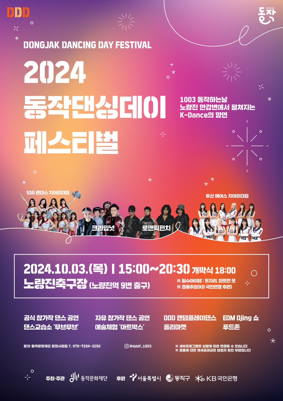2024 동작댄싱데이 페스티벌 Dongjak Dancing Day(DDD) K 열풍을 이어나가는 동작구, 독창적이고 매력 넘치는 K-댄스로 도시의 활력을 불어넣다. 치어리딩, 스트릿댄스, K-POP 댄스, 라틴댄스, 보깅댄스 등 노량진 한강변에서 펼쳐지는 K-Dance의 향연으로 여러분을 초대합니다. 노량진축구장에서 동작해요, 춤을 춰요, 즐겨요 ‘1003 동작하는 날’ 2024 동작댄싱데이 페스티벌(DDD)에서 만나요 ■ 일시 : 2024. 10. 3.(목) 15:00 ~ 20:30 ■ 장소 : 노량진축구장(노량진역 9번 출구) ■ 관람 : 무료 ■ 내용 : 공식참가작 공연, 자유참가작 공연, DDD 랜덤플레이댄스, EDM Djing 쇼, 댄스체험, 예술체험, 플리마켓, 푸드존 ■ 주최/주관 : 동작문화재단 ■ 후원 : 서울특별시, 동작구, KB국민은행 ■ 문의 : 070-7204-3250 (월~금 10:00~18:00, 점심시간 12:00~13:00)