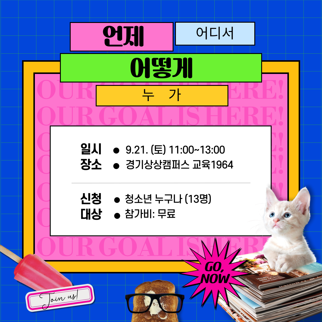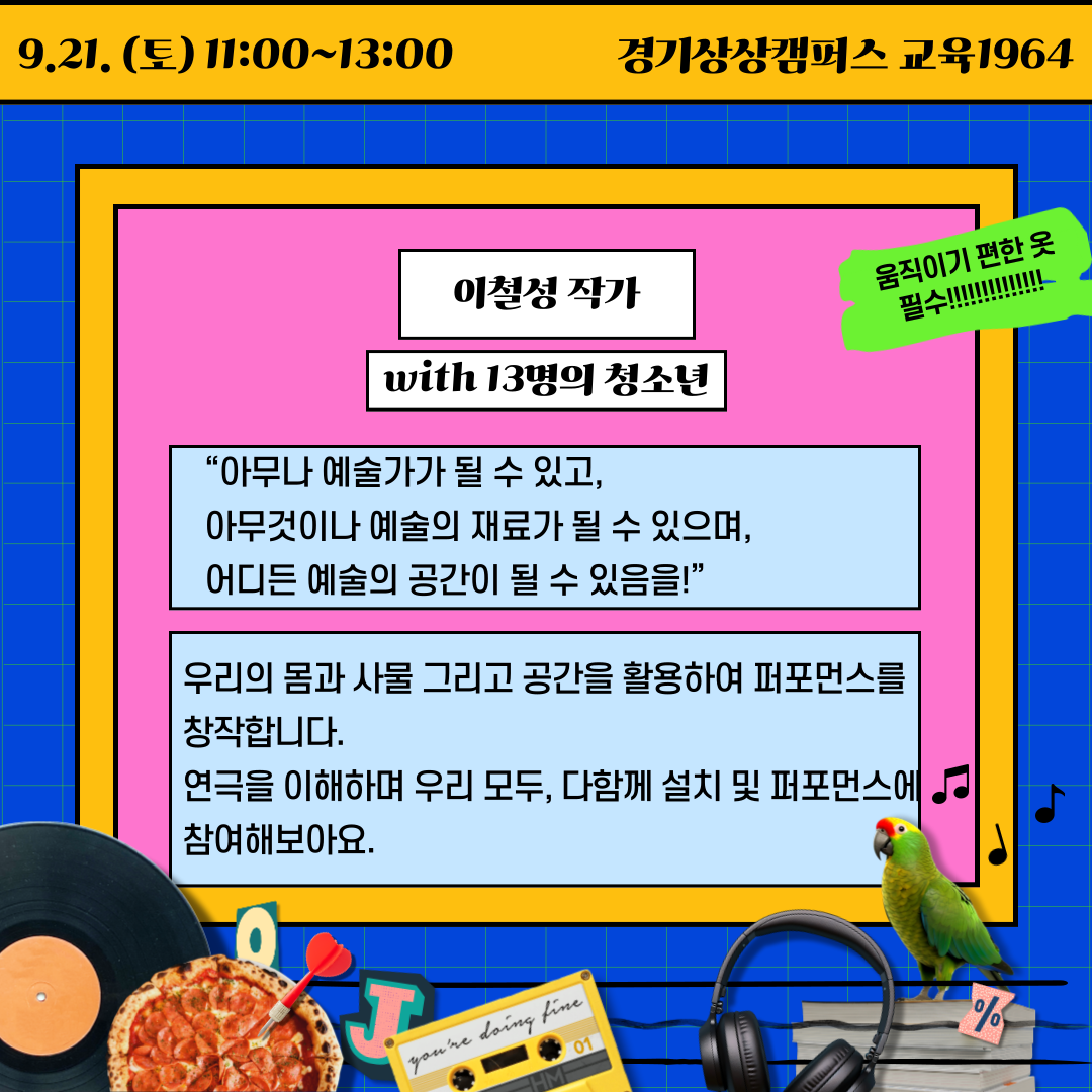 ▶ 자신과 이웃을 깊이 생각하고 위로하는 시간 연극놀이와 설치, 퍼포먼스의 단계를 실행하면서 직접 예술창작을 경험하고, 실내외 공간을 적극 활용하여 예술의 공간으로 창조하는 과정을 체험해 보아요! - 일시: 2024.09.21.(토) 11:00~13:00 - 대상: 9세~24세 - 장소: 경기상상캠퍼스 교육1964 교육랩2 - 참가비: 무료 - 신청하기 https://members.ggcf.kr/events/2324