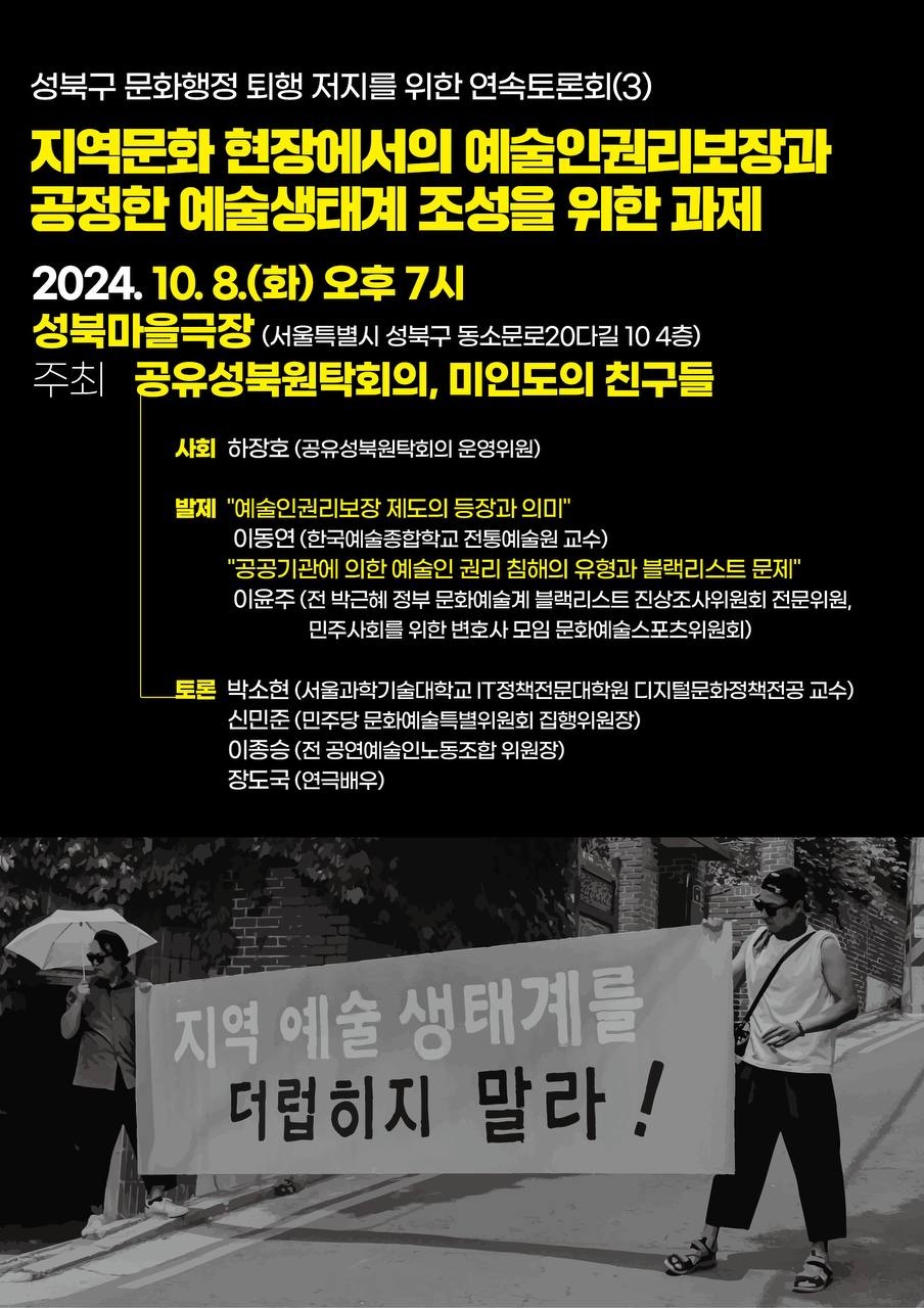 ![]() 성북구 문화행정 퇴행 저지를 위한 연속토론회(3) 지역문화 현장에서의 예술인권리보장과 공정한 예술생태계 조성을 위한 과제 전국에서 지역거버넌스의 모델로 유명했던 성북구의 문화행정이 올해 서노원대표로 인해 급격히 퇴행하고 있습니다. 성북구의 문화행정이 퇴행하지 않도록, 우리는 문제제기하고 공론화할 수 있는 터를 지속해 나갈 것입니다. 이번에는 도시권, 지역문화에 이어 예술인의 권리보장에 관한 토론회를 준비했습니다. 많은 예술인들과 시민들의 관심부탁드립니다. -일시: 2024년 10월 8일(화) 오후7시 -장소: 성북마을극장 (성북구 동소문로20다길 10 세창빌딩 4층) -주최: 공유성북원탁회의, 미인도의 친구들 <사회> 하장호 공유성북원탁회의 운영위원 <발제> "예술인권리보장 제도의 등장과 의미" -이동연 한국예술종합학교 전통예술원 교수 "공공기관에 의한 예술인 권리 침해의 유형과 블랙리스트 문제" -이윤주 전 박근혜 정부 문화예술계 블랙리스트 진상조사위원회 전문위원, 민주사회를 위한 변호사모임 문화예술스포츠위원회 <토론> 박소현_서울과학기술대학교 IT정책전문대학원 디지털문화정책전공 교수 신민준_민주당 문화예술특별위원회 집행위원장 이종승_전 공연예술인노동조합 위원장 장도국_연극배우 <참여신청>