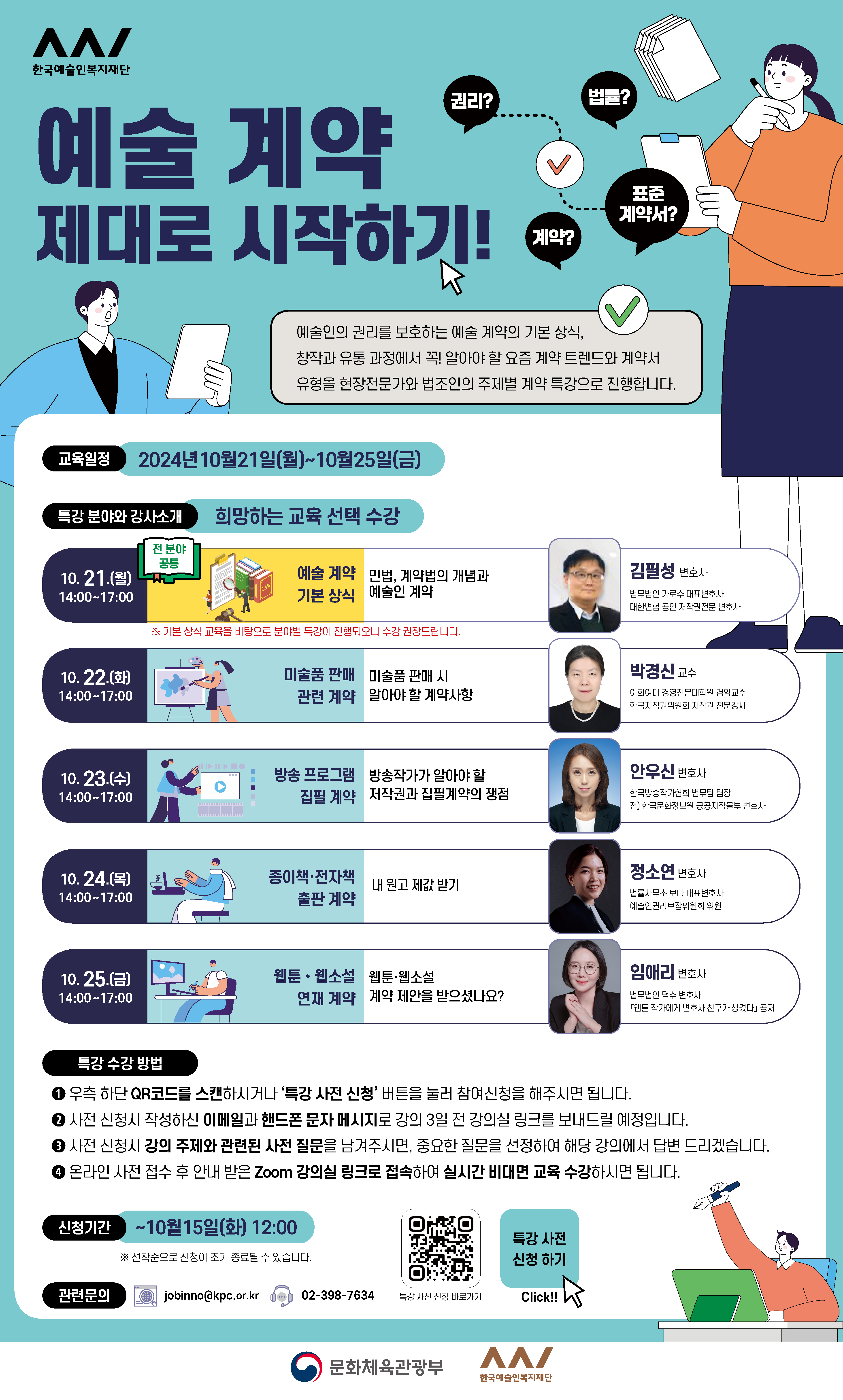 한국예술인복지재단에서 주관하는 "예술 계약 제대로 시작하기" 하반기 특강에 많은 참여 부탁드립니다.(무료) 반드시 신청 링크 혹은 포스터 속 QR코드를 통해 사전 신청하셔야 교육 수강이 가능합니다. - 교육 대상: 관심 있는 예술계 종사자 누구나 - 교육 일정 ⓛ 예술 계약 기본 상식: 2024. 10. 21.(월) 14:00~17:00 ② 미술품 판매 관련 계약: 2024. 10. 22.(화) 14:00~17:00 ③ 방송 프로그램 집필 계약: 2024. 10. 23.(수) 14:00~17:00 ④ 종이책·전자책 출판계약: 2024. 10. 24.(목) 14:00~17:00 ⑤ 웹툰·웹소설 연재 계약: 2024. 10. 25.(금) 14:00~1700 - 신청 기간: ~ 2024. 10. 15.(화) 12:00 - 교육 신청 링크: https://docs.google.com/forms/d/e/1FAIpQLSex0qf3IZabNrxlctvQLylzQPn1XRGBg_nJdr6WMeH8olFRYQ/viewform * 특강 이수자에게는 수료증이 발급됩니다. * 문의: 교육 운영 담당자(02-398-7634, jobinno@kpc.or.kr) ![]()