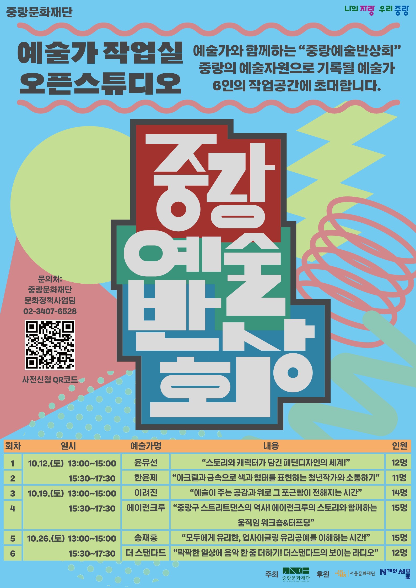 - 일시: 2024.10.12(토)/10.19(토)/10. 26(토) - 시간: 13:00 /15:30 ※프로그램별 일자, 시간 확인 후 신청바랍니다. - 신청기간 : 2024년 9월 13일~ 각 프로그램 시작 3일전까지 - 장소: 중랑구 일대 예술가 작업실 ※ 선착순 마감될 수 있습니다.