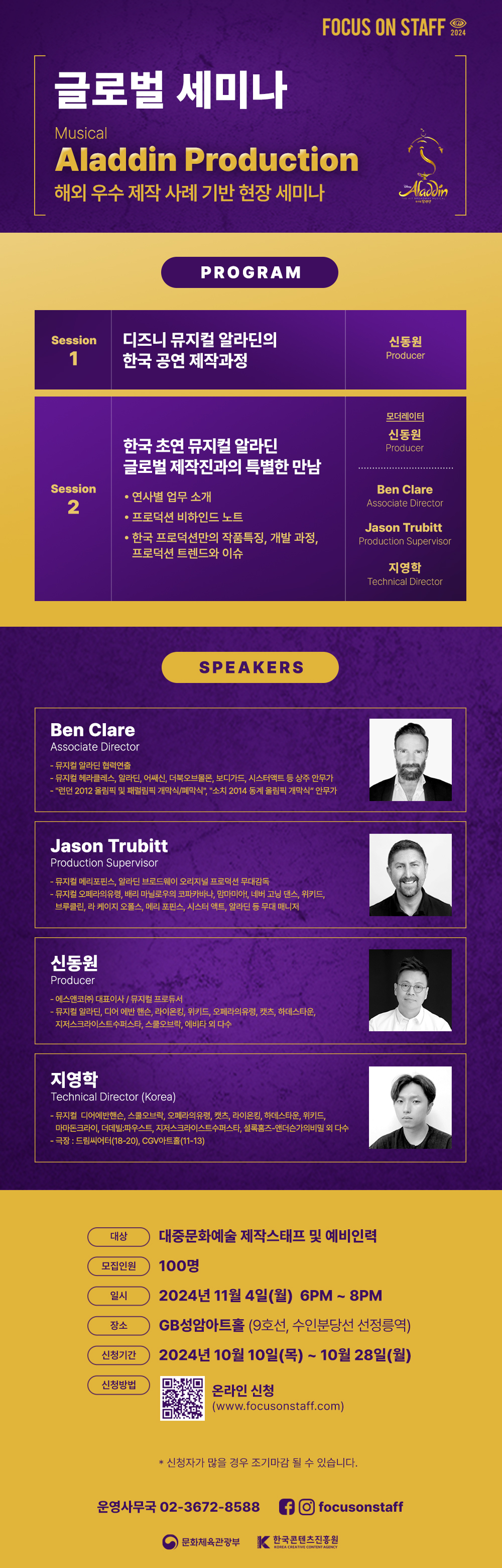 [글로벌 세미나 소개] ▶ 과 정 명 : 글로벌 세미나 (해외 우수 제작 사례 기반 현장 세미나) [Musical Aladdin Production] ▶ 교육일시 : 2024년 11월 4일(월) 6PM ~ 8PM ▶ 교육장소 : GB성암아트홀 ▶ 모집대상 : 대중문화예술 제작스태프 및 예비인력 ▶ SPEAKERS : Ben Clare(Associate Direct) Jason Trubitt(Production Supervis) 신동원(Producer / 에스앤코(주) 대표이사) 지영학(Technical Direct) ※ 교육 세부내용 및 강사진 프로필 등은 첨부파일 또는 홈페이지(focusonstaff.com) 확인