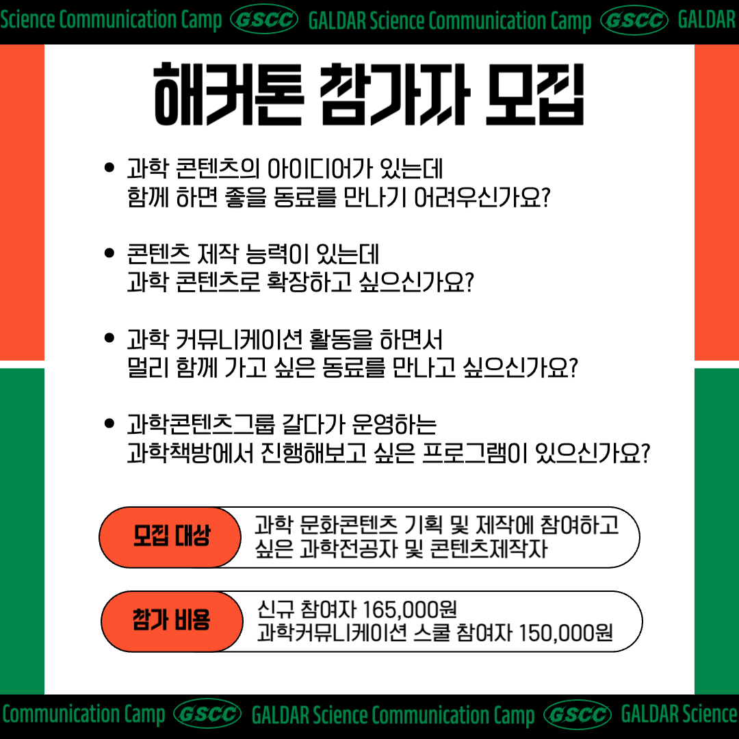 과학콘텐츠그룹 갈다에서 과학 커뮤니케이션 캠프(a.k.a. 해커톤)을 운영합니다! 과학 커뮤니케이션 캠프에서 동료 과학 커뮤니케이터들을 만나고, 동료들을 만나 과학문화콘텐츠를 기획해보세요!