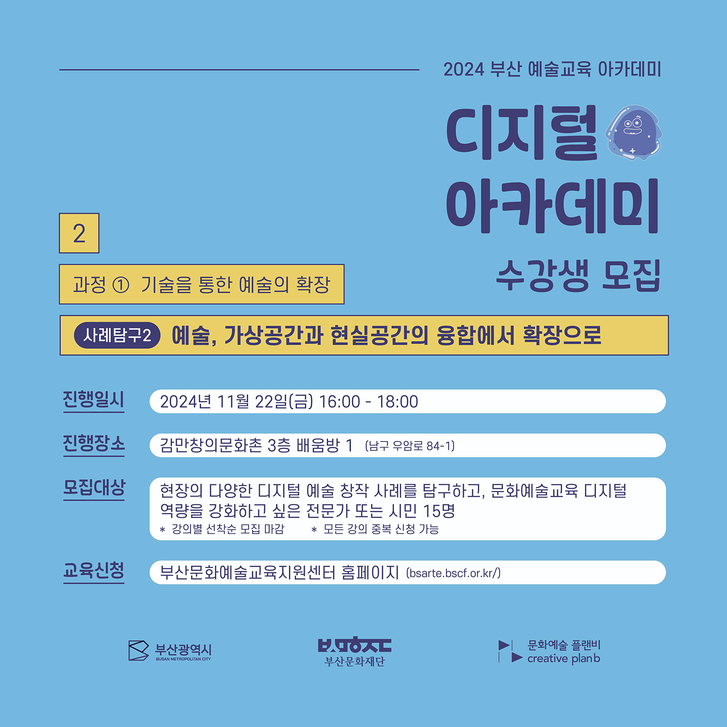 2024 부산예술교육 아카데미는 문화예술교육 활동가로서의 통합적 역량을 강화하고, 새로운 지역형 문화예술교육 프로그램을 발굴, 확산하기 위한 예술교육 프로그램입니다. <디지털 아카데미>는 문화예술교육 관련 전문가 또는 이에 관심 있는 시민들을 대상으로 하는 교육 프로그램으로, 11월 22일(금)에서 24일(일)까지 3일간 6개의 프로그램이 진행됩니다. 두 번째 디지털 아카데미인 <과정1. 기술을 통한 예술의 확장 : 예술, 가상공간과 현실공간의 융합에서 확장으로>는 다양한 디지털 테크닉을 접목한 문화예술의 변화상을 들어보고 새로운 관점과 확장 가능성을 상상해보는 예술교육 프로그램입니다. - 일시: 2024. 11. 22.(금) 16:00 ~ 18:00 - 장소: 감만창의 문화촌 3층 배움방1(남구 우암로 84-1) - 대상: 현장의 다양한 디지털 예술 창작 사례를 탐구하고, 문화예술교육 역량을 강화하고 싶은 전문가 또는 시민 15명 - 신청: 부산문화예술교육지원센터 홈페이지(bsarte.bscf.or.kr) - 비용: 무료 - 문의: 문화예술 플랜비 051-622-6200 *신청확인 및 교육안내 등은 11/21(목)에 문자로 일괄 안내 예정입니다.