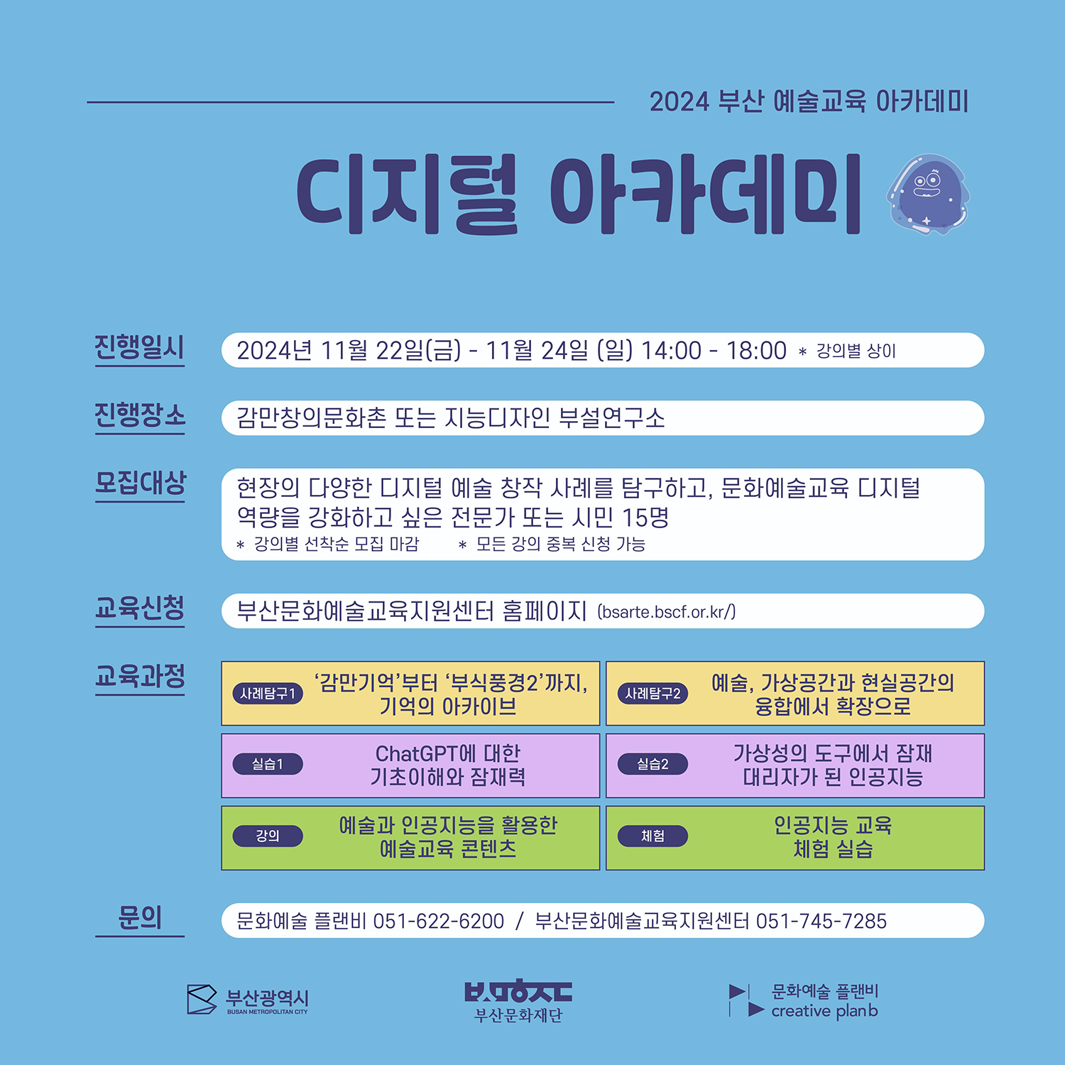 2024 부산예술교육 아카데미는 문화예술교육 활동가로서의 통합적 역량을 강화하고, 새로운 지역형 문화예술교육 프로그램을 발굴, 확산하기 위한 예술교육 프로그램입니다. <디지털 아카데미>는 문화예술교육 관련 전문가 또는 이에 관심 있는 시민들을 대상으로 하는 교육 프로그램으로, 11월 22일(금)에서 24일(일)까지 3일간 6개의 프로그램이 진행됩니다. 세 번째 디지털 아카데미인 <과정2. 챗GPT, 마법과 마술 사이에서 : ChatGPT에 대한 기초이해와 잠재력>은 ChatGPT로 제작한 예술작품을 살펴보고 text to image 모델을 직접 사용해 보는 예술교육 프로그램입니다. - 일시: 2024. 11. 23.(토) 14:00 ~ 16:00 - 장소: 감만창의 문화촌 3층 배움방1(남구 우암로 84-1) - 대상: 현장의 다양한 디지털 예술 창작 사례를 탐구하고, 문화예술교육 역량을 강화하고 싶은 전문가 또는 시민 15명 - 신청: 부산문화예술교육지원센터 홈페이지(bsarte.bscf.or.kr) - 비용: 무료 - 문의: 문화예술 플랜비 051-622-6200 *신청확인 및 교육안내 등은 11/21(목)에 문자로 일괄 안내 예정입니다.
