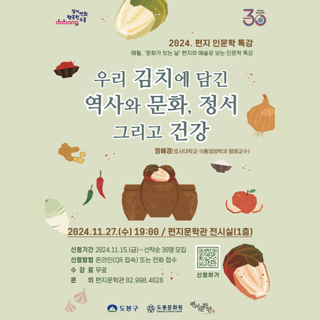 ▪ 강의일시: 2024.11.27.(수) 19:00 ▪ 강의장소: 편지문학관 전시실(1층) ▪ 강의주제: "우리 김치에 담긴 역사와 문화, 정서 그리고 건강" ▪ 강 연 자: 정혜경(호서대학교 식품영양학과 명예교수) ▪ 접수기간: 2024.11.15.(금)~선착순 접수 30명 ▪ 접수방법: 온라인(QR, 홈페이지) 또는 전화 접수 ▪ 수 강 료: 무료 ▪ 신청하기: https://forms.gle/2txutmawX8vdeENk9 ▪ 문 의: 편지문학관 02-998-4028