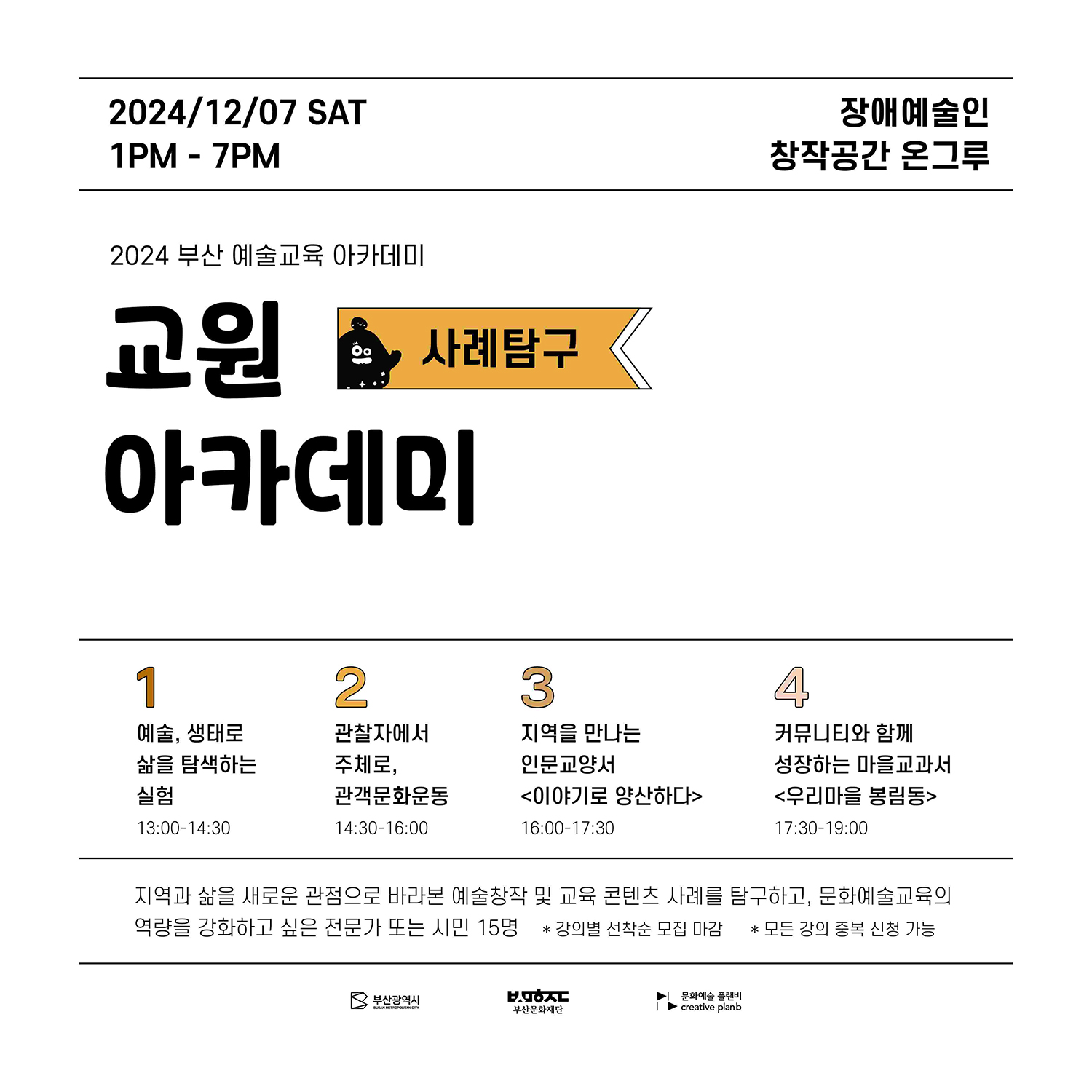 2024 부산예술교육 아카데미는 문화예술교육 활동가로서의 통합적 역량을 강화하고, 새로운 지역형 문화예술교육 프로그램을 발굴, 확산하기 위한 예술교육 프로그램입니다. <교원 아카데미>는 학교문화예술교육 매개자 및 학교문화예술교육에 관심 있는 시민을 위한 프로그램으로, 12월 7일(토), 8일(일) 양일간 진행됩니다. 7일(토) 진행되는 ‘사례탐구’ 과정은 지역과 만나는 교육 프로그램과 콘텐츠에 대한 이해와 시각의 확장을 위한 4개의 강의로 구성되어 있으며, 모든 강의는 개별·중복 신청이 가능합니다. 지역과 삶을 새로운 관점으로 바라본 예술창작 및 교육 콘텐츠 사례를 탐구하고, 문화예술교육의 역량을 강화하고 싶은 분들의 많은 참여를 기다립니다. ✔일시: 2024. 12. 07.(토) 13:00 ~ 19:00 ✔장소: 장애예술인 창작공간 온그루 - 온그루홀(수영구 망미번영로 25-2) ✔대상: 교원, 교육 행정가·연구자 및 학교문화예술교육에 관심 있는 누구나 ✔신청: 부산문화예술교육지원센터 홈페이지(bsarte.bscf.or.kr) ✔비용: 무료 ✔문의: 문화예술 플랜비 051-622-6200 *각 강의별 선착순 15명 / 모든 강의 중복 신청 가능 *신청확인 및 교육안내 등은 12/6(금)에 문자로 일괄 안내 예정입니다.