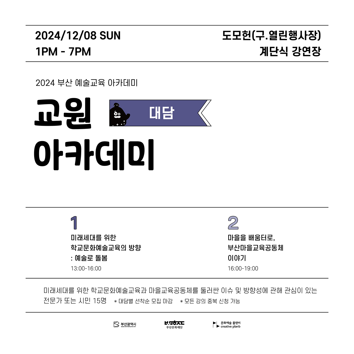 2024 부산예술교육 아카데미는 문화예술교육 활동가로서의 통합적 역량을 강화하고, 새로운 지역형 문화예술교육 프로그램을 발굴, 확산하기 위한 예술교육 프로그램입니다. <교원 아카데미>는 학교문화예술교육 매개자 및 학교문화예술교육에 관심 있는 시민을 위한 프로그램으로, 12월 7일(토), 8일(일) 양일간 진행됩니다. 8일(일) 진행되는 ‘대담’ 과정은 학교문화예술교육을 둘러싼 다양한 환경과 문제의식에 대한 소통 및 담론을 형성하기 위한 2개의 주제로 구성되어 있으며, 모든 프로그램은 개별·중복 신청이 가능합니다. 미래세대를 위한 학교문화예술교육과 마을교육공동체를 둘러싼 이슈 및 방향성에 관해 관심이 있는 분들의 많은 참여를 기다립니다. ✔일시: 2024. 12. 08.(일) 13:00 ~ 19:00 ✔장소: 도모헌 계단식 강연장(수영구 황령산로7번길 60) ✔대상: 교원, 교육 행정가·연구자 및 학교문화예술교육에 관심 있는 누구나 ✔신청: 부산문화예술교육지원센터 홈페이지(bsarte.bscf.or.kr) ✔비용: 무료 ✔문의: 문화예술 플랜비 051-622-6200 *각 대담별 선착순 15명 / 모든 강의 중복 신청 가능 *신청확인 및 교육안내 등은 12/6(금)에 문자로 일괄 안내 예정입니다.