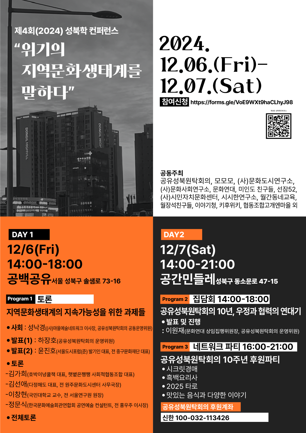 •일시 : 2024년 12월 06일(금)~07일(토) •장소 : 공백공유(12/06), 공간민들레(12/07) •공동주최 : 공유성북원탁회의, 모모모, (사)문화도시연구소, (사)문화사회연구소, 문화연대, 미인도 친구들, 선잠52, (사)시민자치문화센터, 시시한연구소, 월간동네교육, 월장석친구들, 이야기청, 키후위키, 협동조합고개엔마을 외